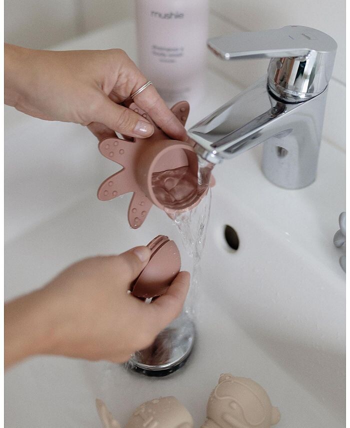 Мягкий материал, изготовленный из 100 % пищевого силикона, легко держать маленькими ручками, когда он влажный или сухой. Изобретательная конструкция позволяет каждой игрушке открываться на две отдельные части для тщательной очистки и быстрой сушки.