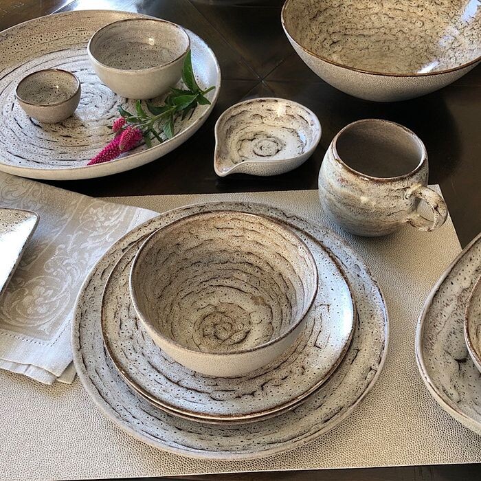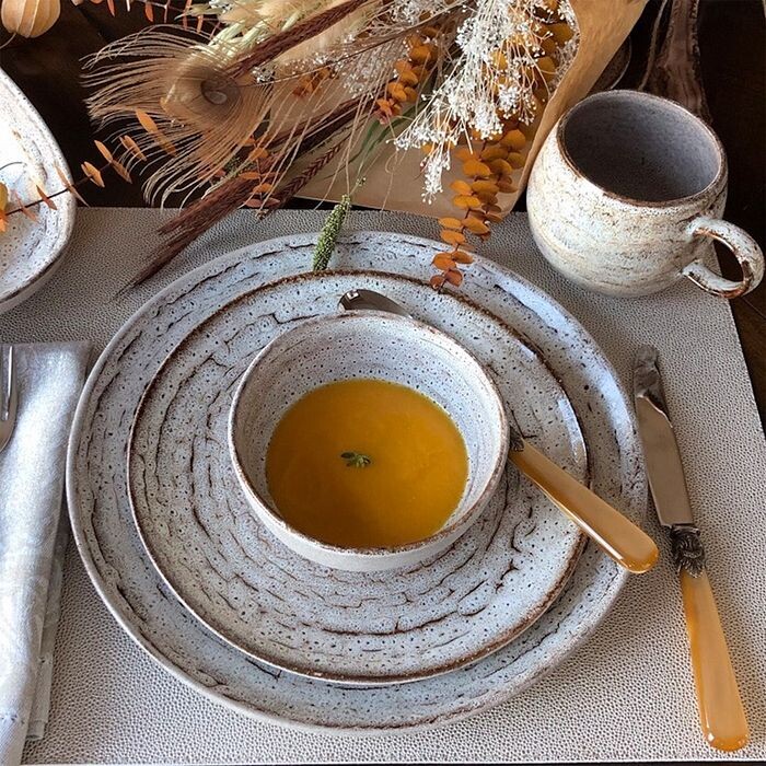 Эта просторная обеденная тарелка была создана с использованием трудоемкого процесса многократной глазури