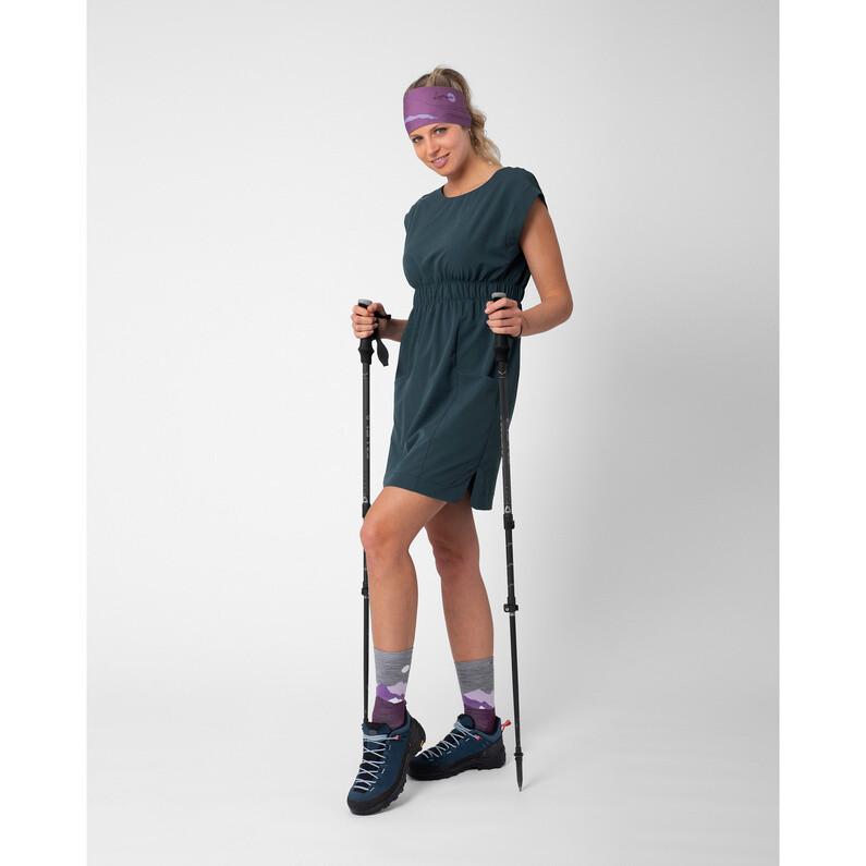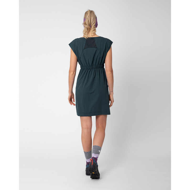 Платье, изготовленное из переработанного полиэстера и эластана, сочетает в себе функциональность и экологичность. Смесь материалов не только дышащая, быстросохнущая и регулирующая влагу, но и идеальный выбор для активных дней. При повышении температуры сетчатые панели в верхней части спины обеспечивают дополнительную вентиляцию. Но особенность платья не только в технологии: естественный женственный силуэт позволяет носить его по-разному. Собираетесь ли вы в поход, путешествуете или гуляете по городу – с этим платьем вы всегда будете одеты уместно!