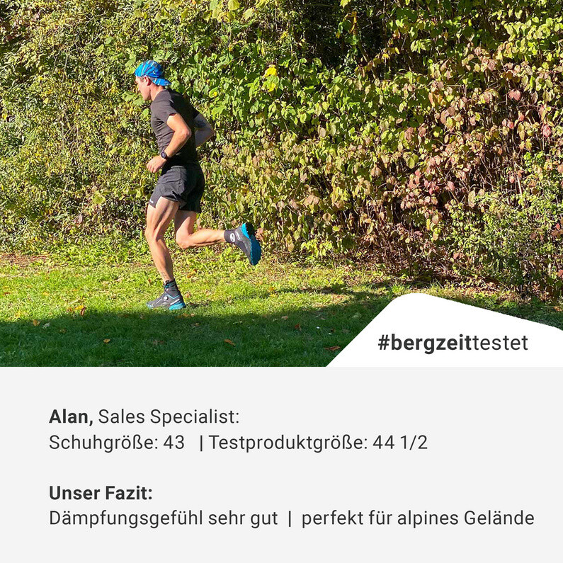 Вывод тестера Алана:Я пробовал обувь на всех типах местности. Ощущение амортизации всегда было превосходным. Кроссовки доставляют больше всего удовольствия в альпийской местности.