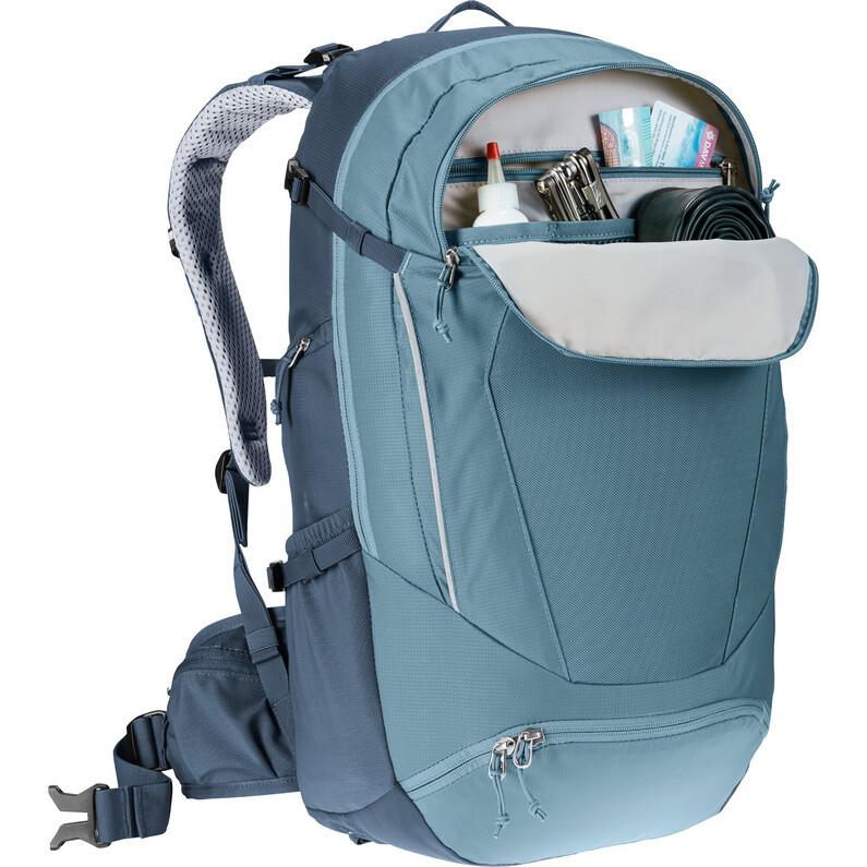 Fit, которая обеспечивает отличную циркуляцию воздуха и удобна в ношении. Также имеется встроенная регулировка бокового сжатия и вытягивания вперед, которая компактно и надежно фиксирует рюкзак на спине. Deuter не был бы Deuter, если бы рюкзак Trans Alpine 30 не был оснащен хорошо продуманными деталями, значительно облегчающими его использование в повседневной езде на велосипеде. Сюда входит отделение для воздушного насоса, а также держатель для очков, встроенный дождевик со встроенным карманом для мигающего света и эластичный просторный передний карман для вещей, которые должны быть под рукой. В 30-литровой версии в основном отделении достаточно места для смены одежды и провизии. Чтобы горные велосипедисты были оптимально экипированы для длительных поездок в летнюю жару, в рюкзаке также имеется отделение для систем гидратации емкостью до 3 литров. Чтобы было удобнее сидеть во время перерывов, на борту также имеется удобная подушка для сиденья. Это делает рюкзак Deuter Trans Alpine 30 идеальным компаньоном для вашего следующего велопутешествия — будь то продолжительный тур выходного дня или Transalp!