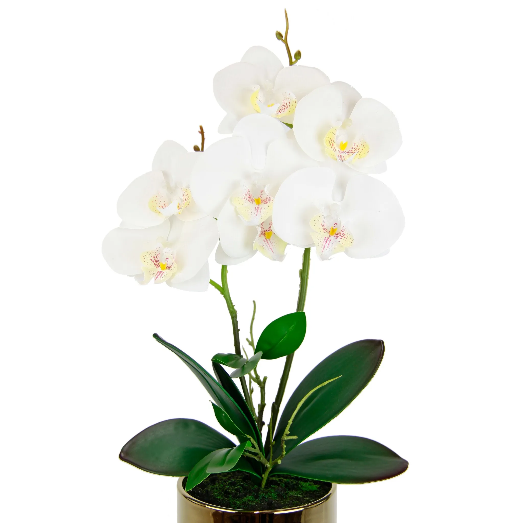 Искусственная орхидея Фаленопсис – это декоративная приманка для дома. Визуально этот искусственный цветок с цветочными шипами, листьями орхидеи и воздушными корнями впечатляет своей точной и детальной копией этого красивого вида орхидей. Поскольку эта орхидея не требует света, как настоящие растения, ее также можно размещать в нишах и комнатах с низким уровнем освещенности. Например, он отлично смотрится на серванте, на подоконнике или на столе в гостиной. Этот распустившийся цветок очень красиво послужит украшением свадьбы, дня рождения и других торжеств. Он изготовлен из высококачественного полиэстера, пластика и керамики. Помещенное в привлекательную керамическую чашу цветущее искусственное комнатное растение «Фаленопсис» является декоративным дополнением дома и практически неотличимо от настоящего. Отличная идея для подарка!