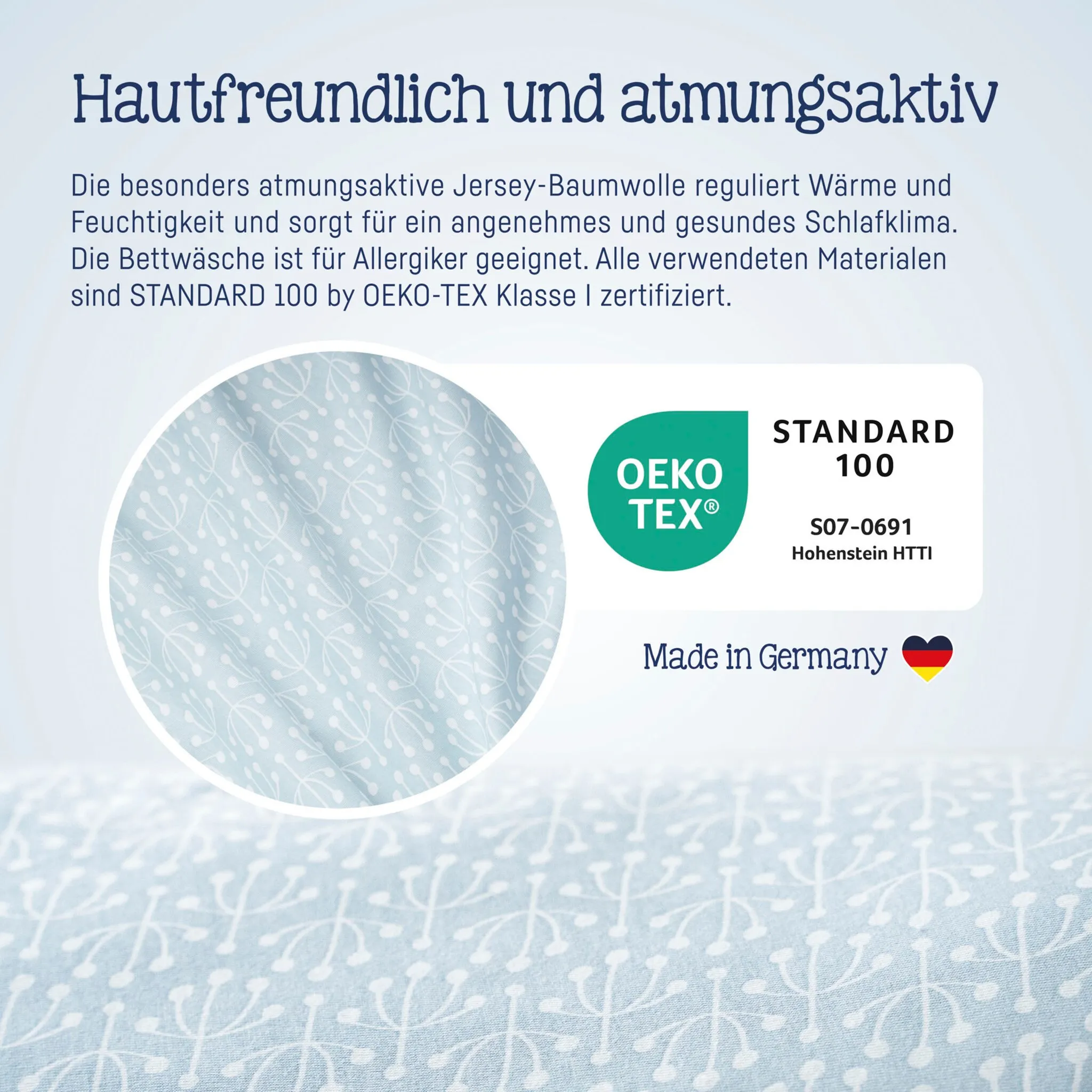 Постельное белье JULIUS ZÖLLNER из особо мягкого, но прочного хлопкового трикотажа, тщательная обработка, состоит из наволочки и пододеяльника, размер 100x135 + 40x60 см или 80x80 + 35x40 см, отмечено знаком STANDARD 100 от OEKO-TEX, класс продукта 1, производство Германия. , можно стирать, см. этикетку по уходу на изделии, можно стирать в деликатном режиме при температуре до 40°C, можно сушить в барабанной машине