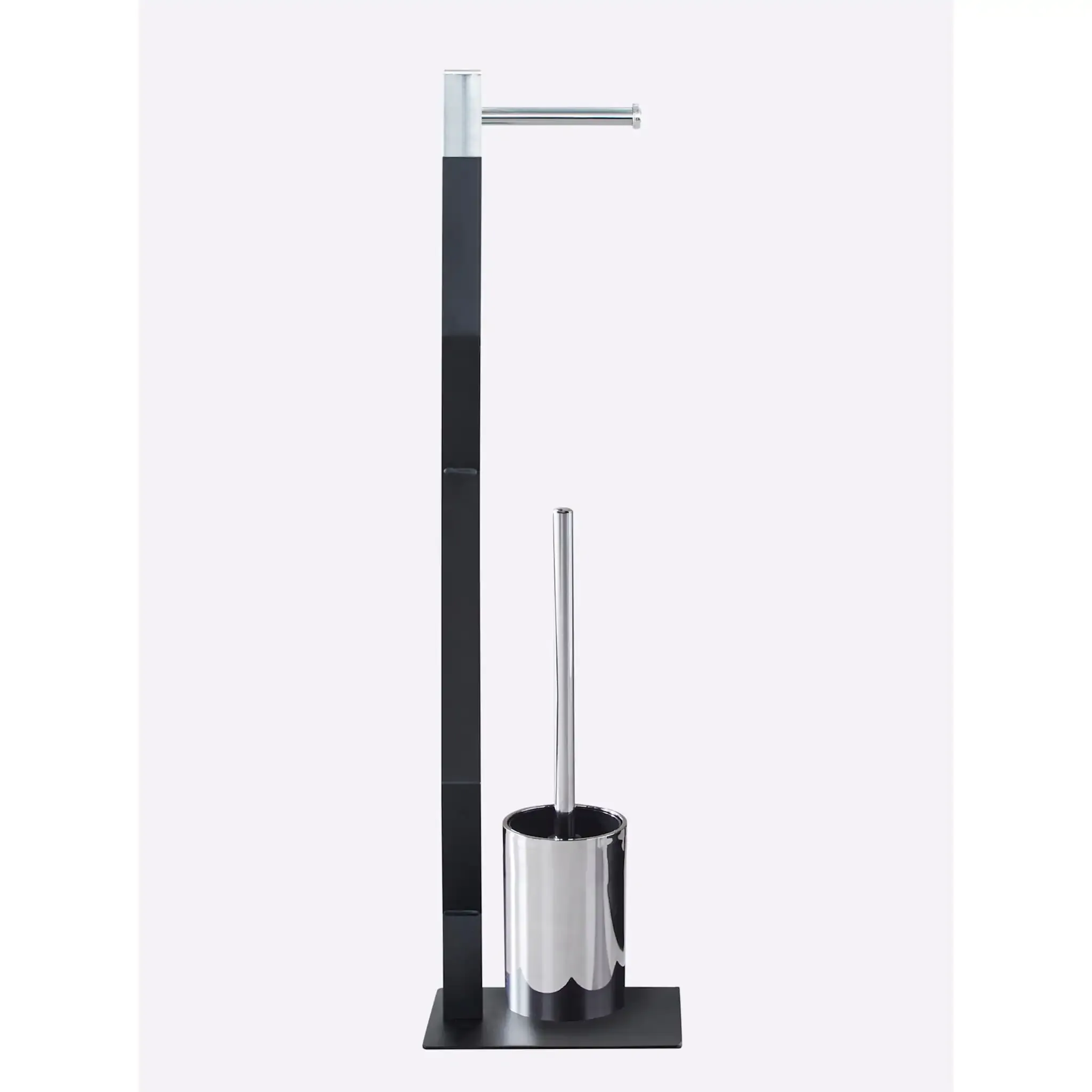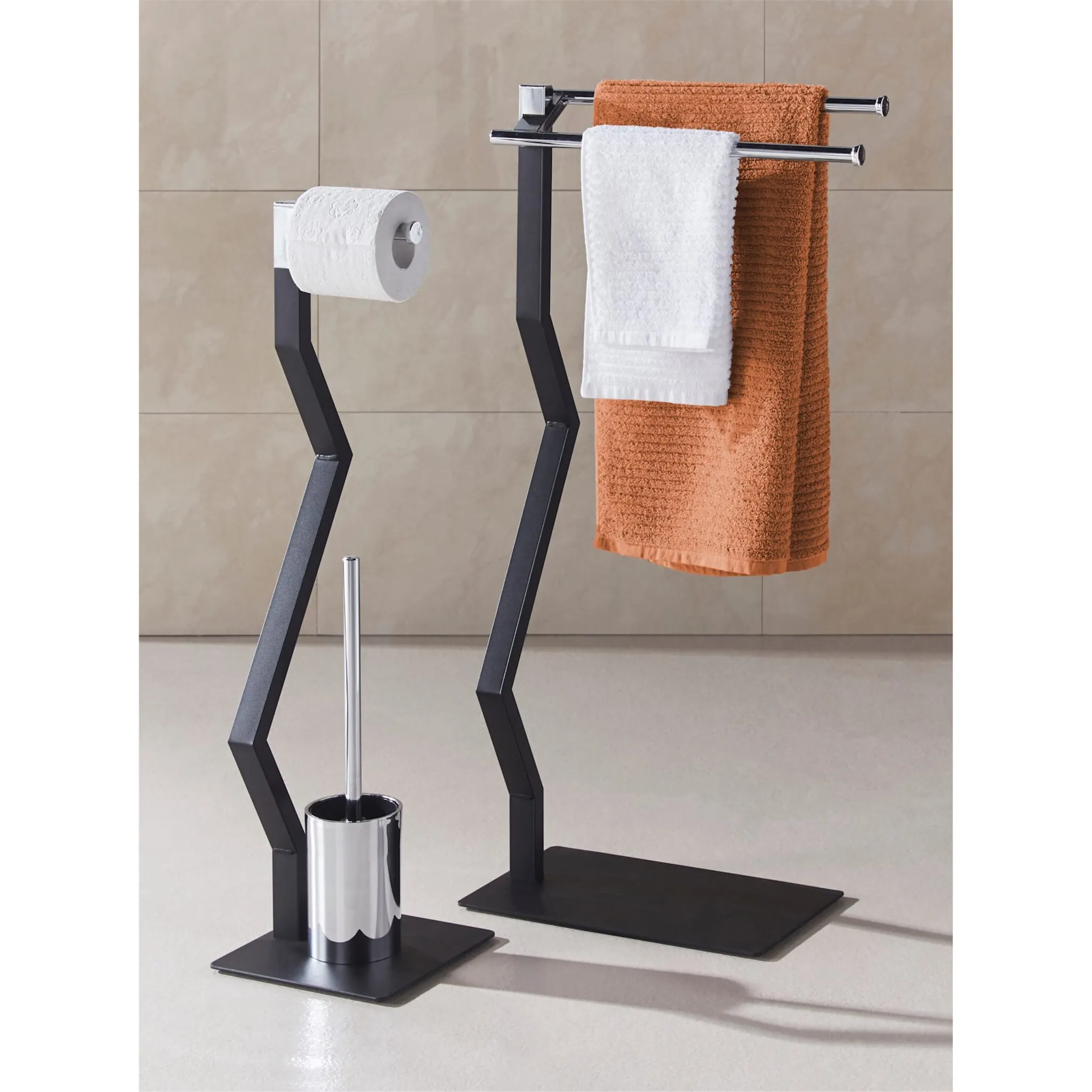 Унитаз зигзагообразной формы. Каркас и основание из металла, подвергнутого пескоструйной обработке, шероховатого и матового вида. 2 держателя рулонов из хромированного металла. Щеточкодержатель из хромированного пластика, с черной пластиковой вставкой, съемный. Ершик для унитаза, хромированная металлическая ручка, со съемной насадкой. Широкое устойчивое основание с пластиковыми ручками. Самостоятельная сборка.