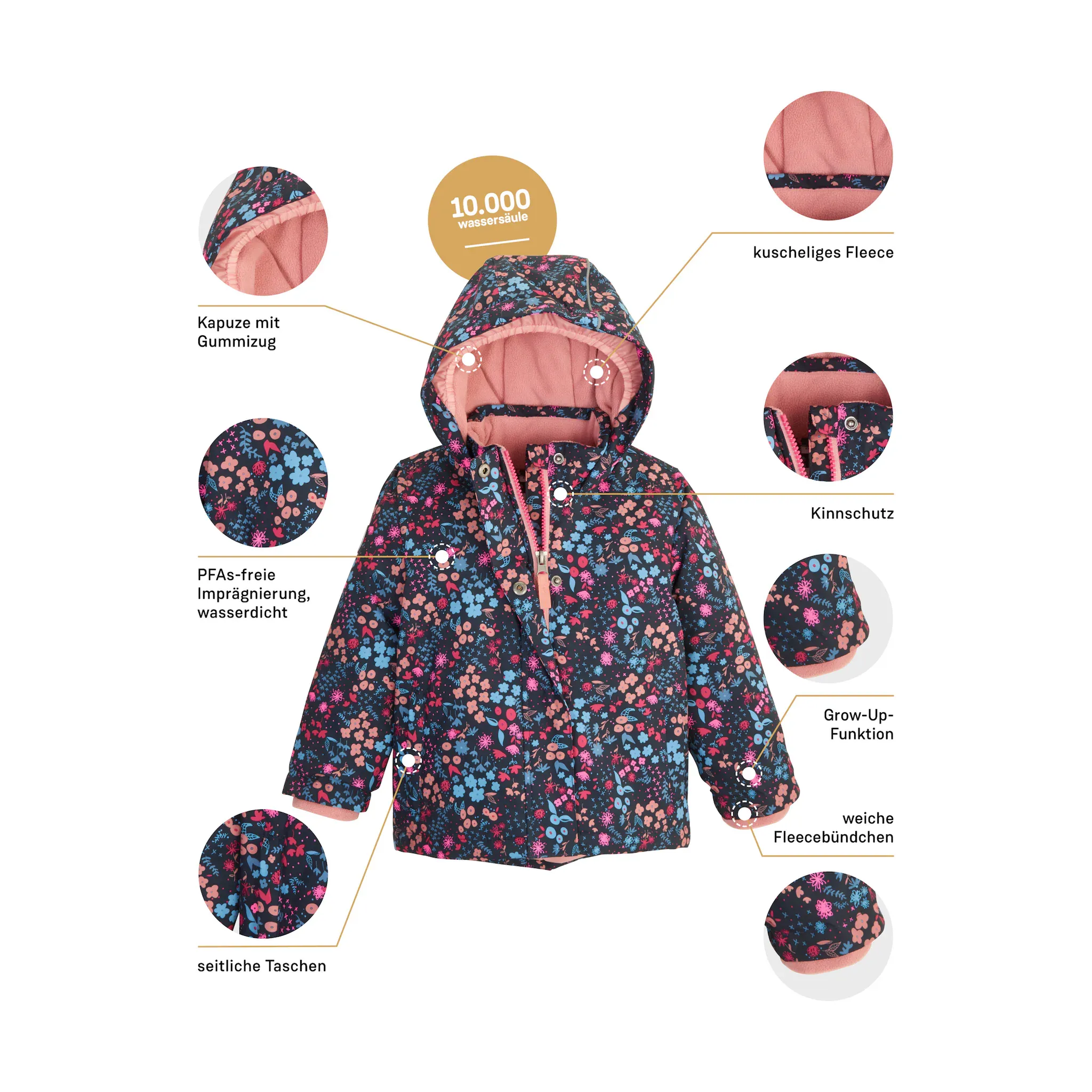Функциональная куртка для малышей с капюшоном. Водяной столб 10 000 мм, швы проклеены, водонепроницаемость. Функция взросления Молния с клапаном и защитой подбородка. Гидроизоляция без ПФА, полезна для вас и окружающей среды