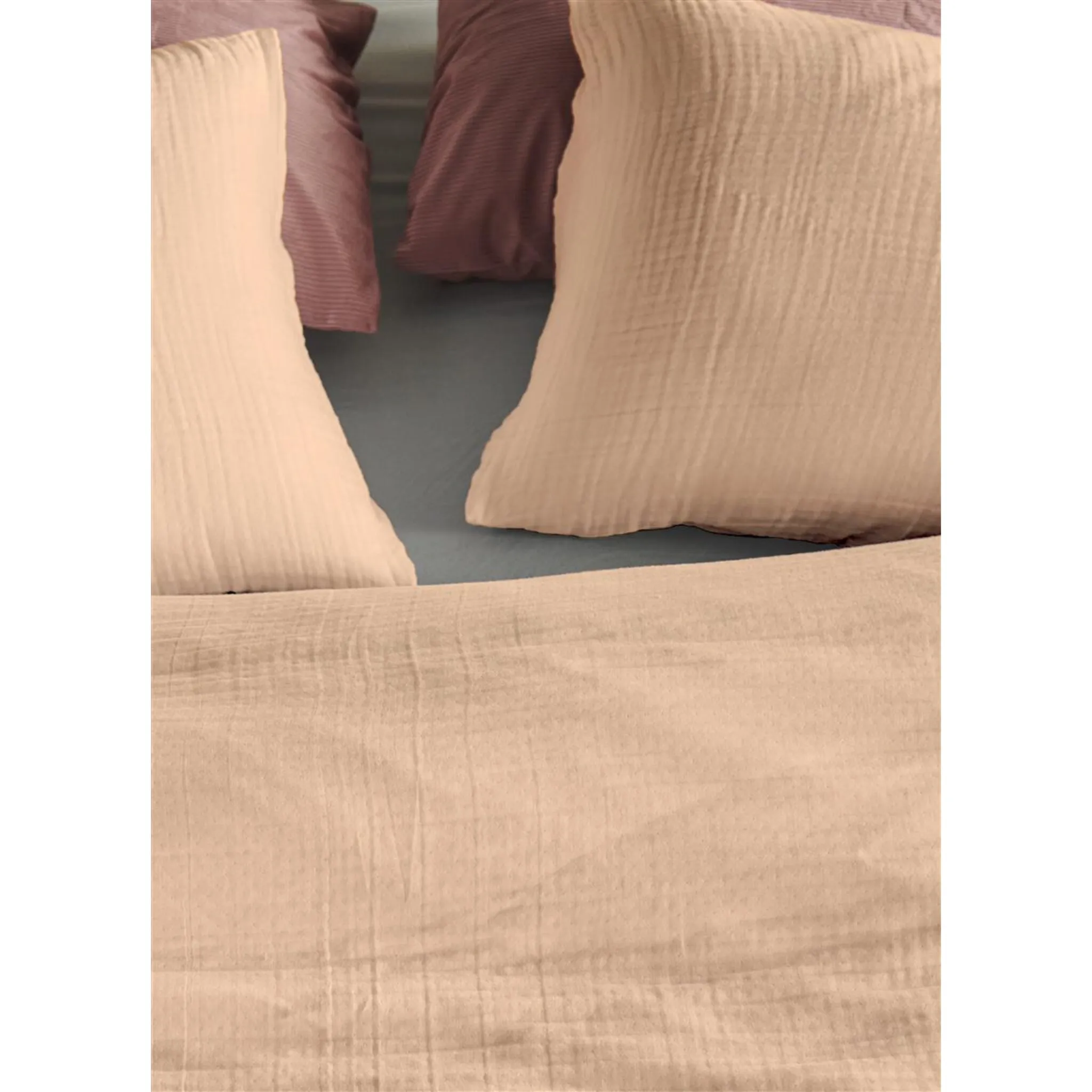 Постельное белье Optimism из коллекции At Home by Bedding House является исключительным, поскольку передняя часть пододеяльника изготовлена из муслина, также известного как тройная хлопчатобумажная марля. Отдельные слои ткани слегка скручены, создавая эффект складок. Материал делает постельное белье приятным для кожи и воздушным, хорошо впитывает влагу и быстро сохнет. Задняя часть пододеяльника изготовлена из чистого хлопка. Постельное белье доступно в разных цветах.