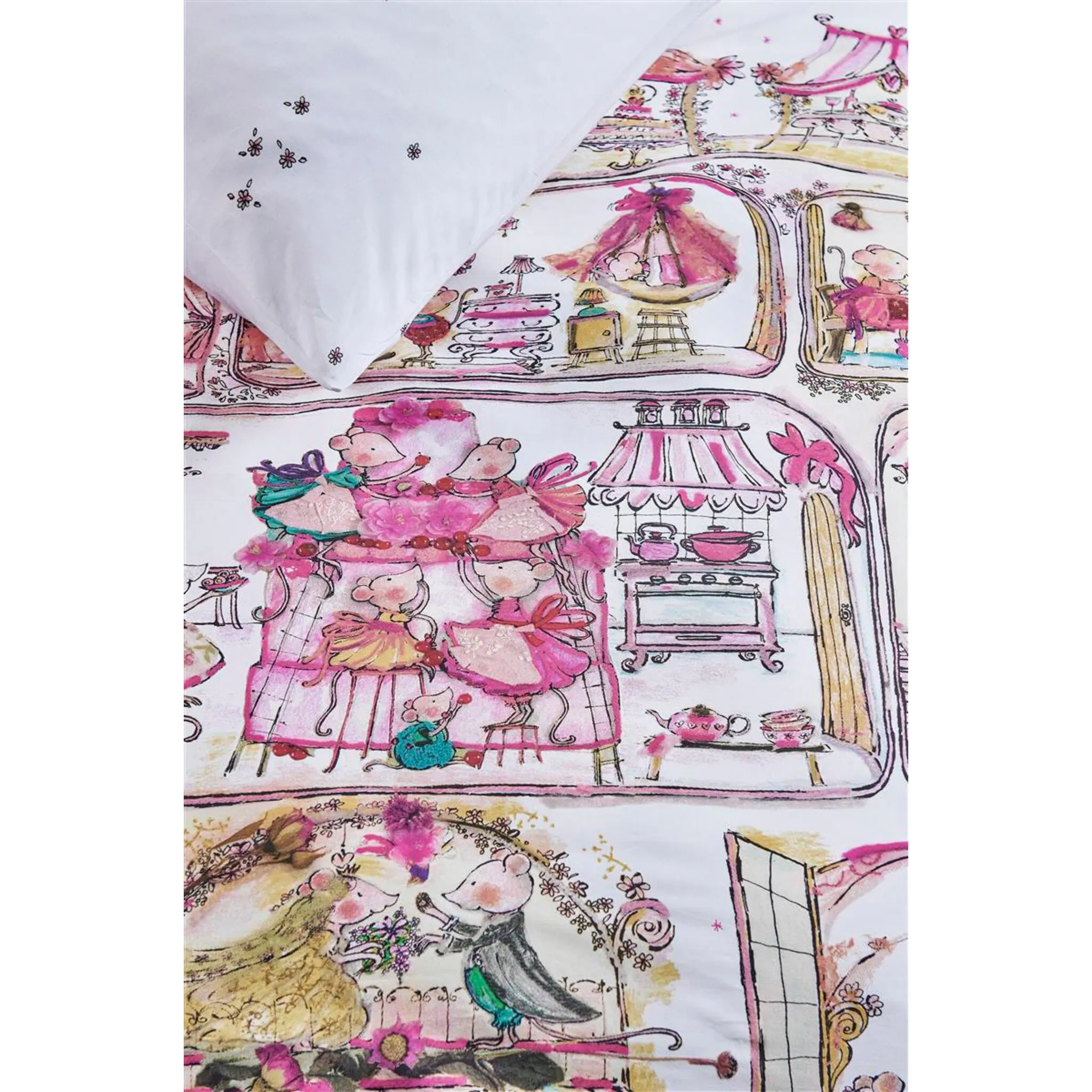 Детское постельное белье Mousehouse украшено прекрасными рисунками Ханнеке де Ягер. Здесь можно увидеть милых мышек, сказочных принцесс и девушек в красивых платьях. Все эти персонажи изображены в игривом мышином домике. Фон белый. На наволочке изображены маленькие цветы. Постельное белье идеально подойдет для комнаты настоящей принцессы.