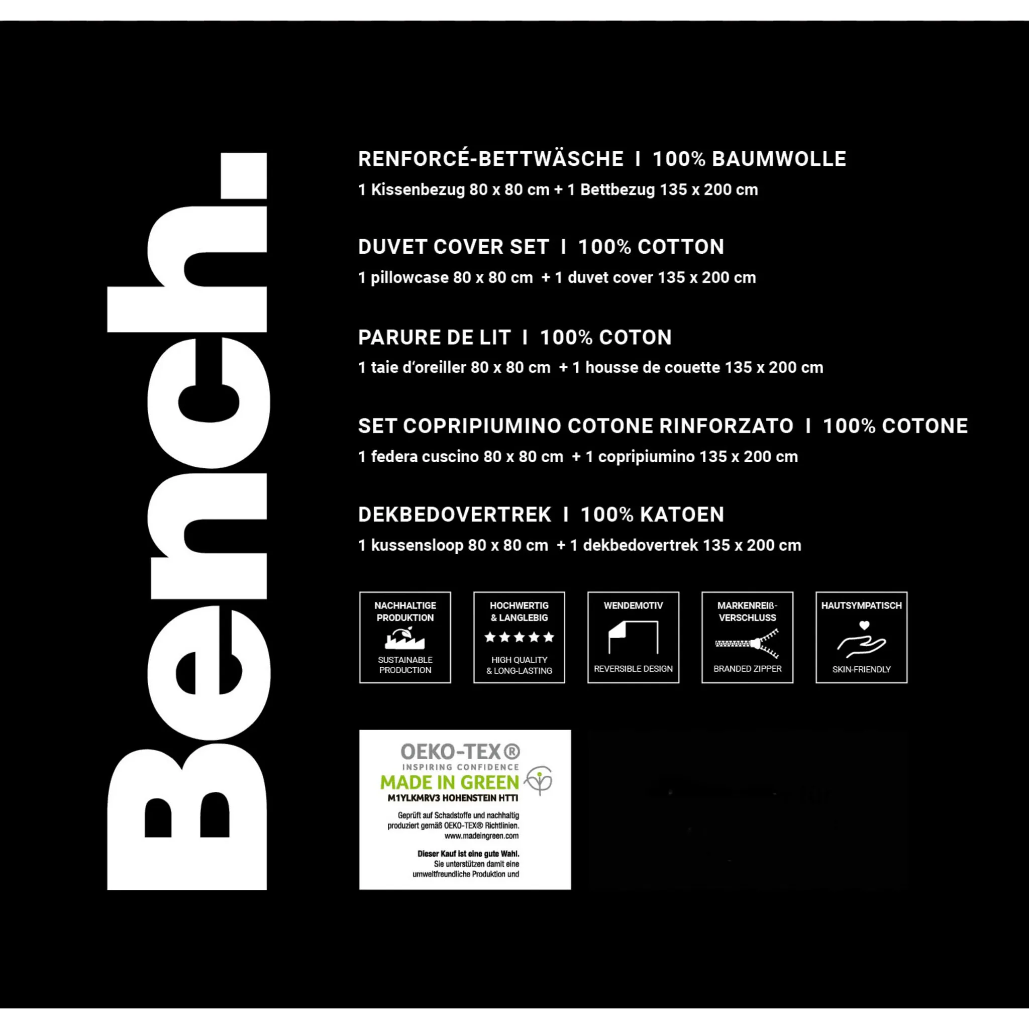 Помимо отборных экологически чистых материалов, основой качества продукции являются очень хорошие условия труда и высокая удовлетворенность сотрудников. Этот товар из коллекции Bench Home & Living производится только на избранных производственных предприятиях, присоединившихся к инициативе Business Social Compliance Initiative, или сокращенно amfori BSCI. Это великолепное двустороннее постельное белье с надписью Bench привлечет внимание и доставит вам удовольствие. Благодаря мягкому хлопку (Renforceé, 100% хлопок) постельное белье обеспечивает приятную атмосферу для сна. Комплект можно стирать в машине при температуре 60°C, а затем сушить в стиральной машине. И наволочка, и пододеяльник оснащены практичной фирменной молнией. Благодаря красивому двустороннему виду наволочки и пододеяльника постельное белье идеально впишется в любую спальню.