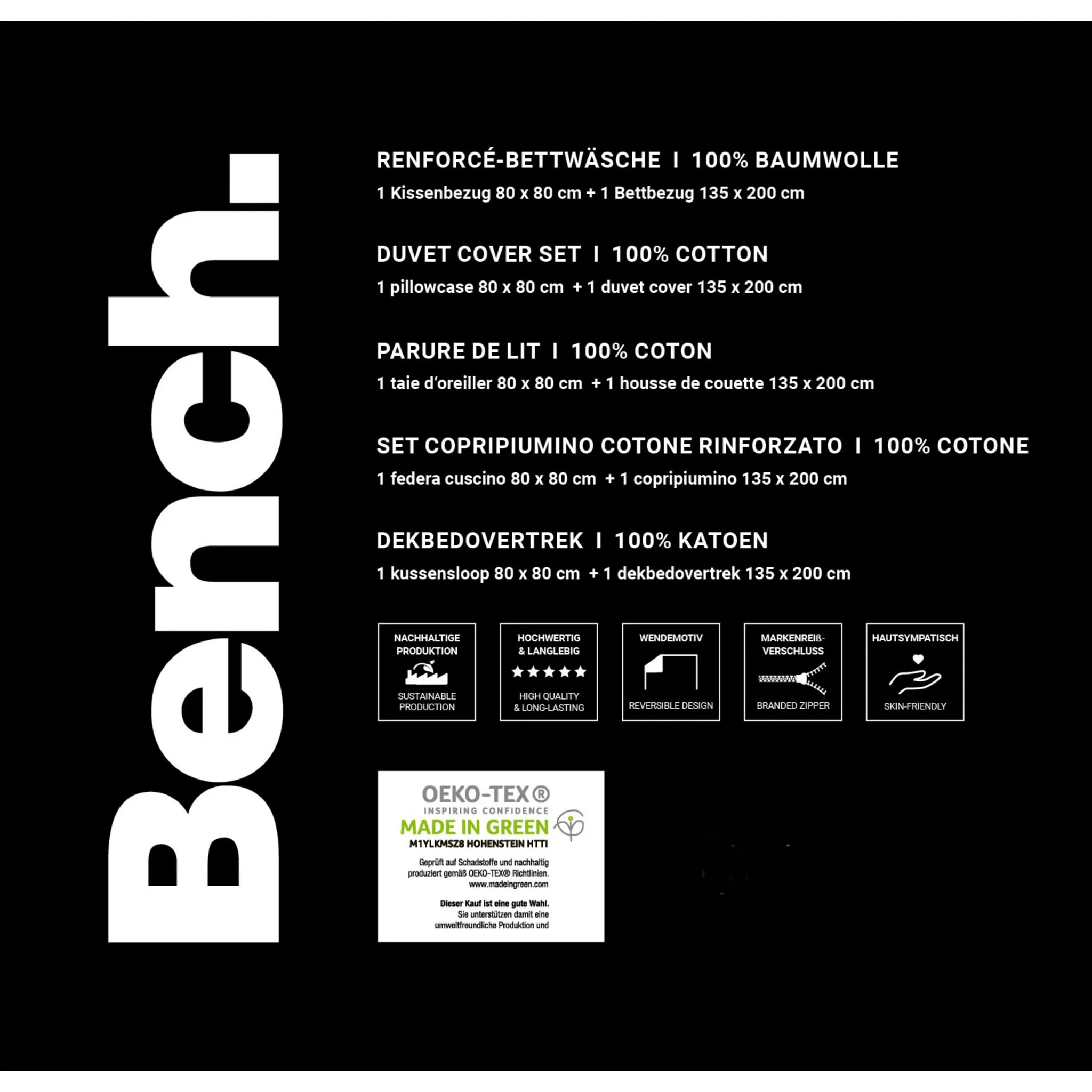 Помимо отборных экологически чистых материалов, основой качества продукции являются очень хорошие условия труда и высокая удовлетворенность сотрудников. Этот товар из коллекции Bench Home & Living производится только на избранных производственных предприятиях, присоединившихся к инициативе Business Social Compliance Initiative, или сокращенно amfori BSCI. Это великолепное двустороннее постельное белье с надписью Bench привлечет внимание и доставит вам удовольствие. Благодаря мягкому хлопку (Renforceé, 100% хлопок) постельное белье обеспечивает приятную атмосферу для сна. Комплект можно стирать в машине при температуре 60°C, а затем сушить в стиральной машине. И наволочка, и пододеяльник оснащены практичной фирменной молнией. Благодаря красивому двустороннему виду наволочки и пододеяльника постельное белье идеально впишется в любую спальню.