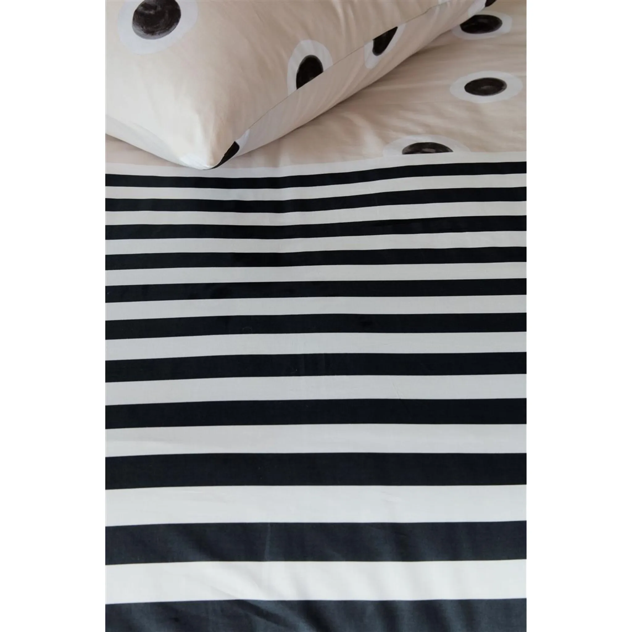 Постельное белье Stripe and Eye от vtwonen украшено узором из точек и полос. Верхняя часть пододеяльника украшена узором из нарисованных вручную черно-белых точек на кремовом фоне. На нижней стороне пододеяльника имеется узор из горизонтальных черно-белых полос. Передняя и задняя часть пододеяльника выполнены одинаково.