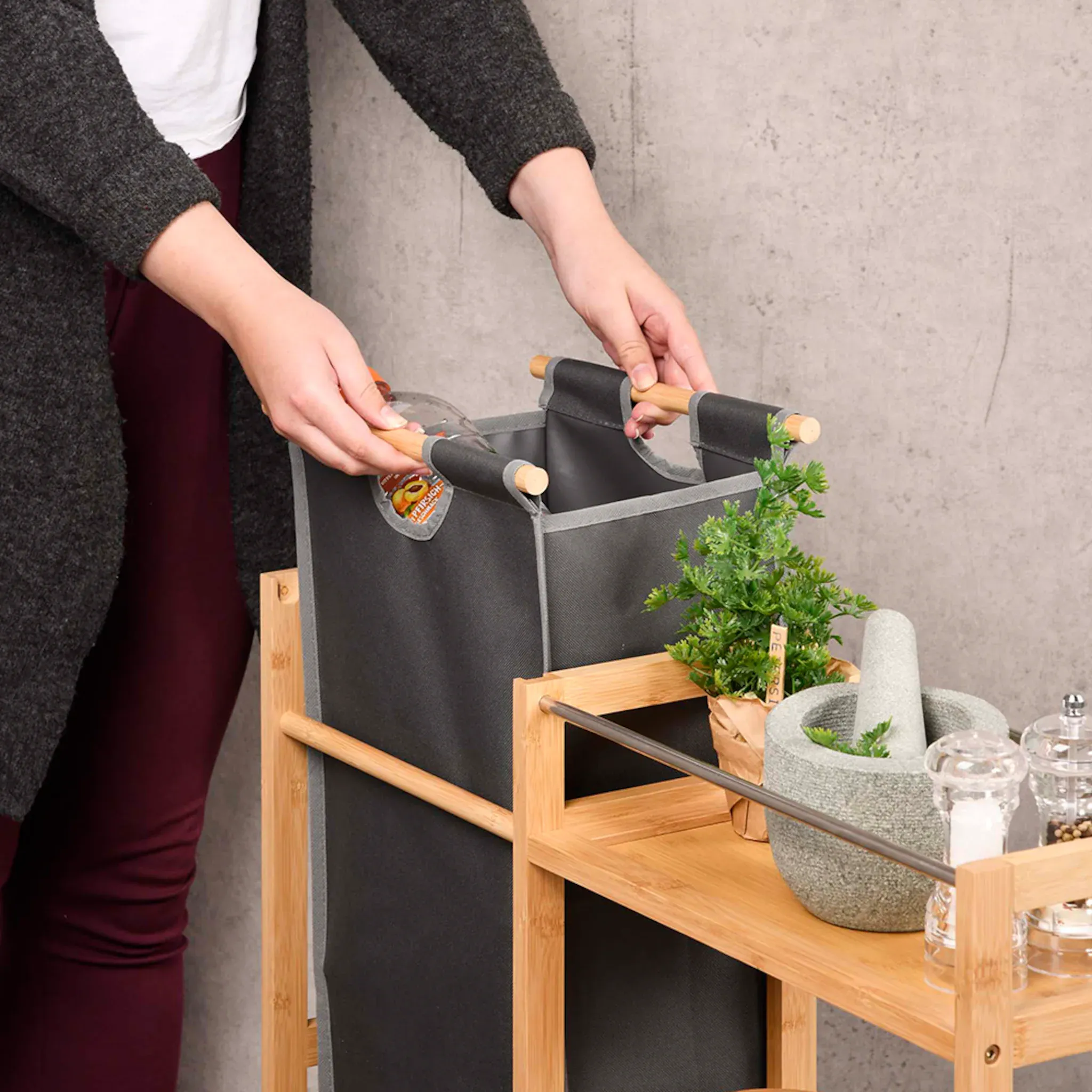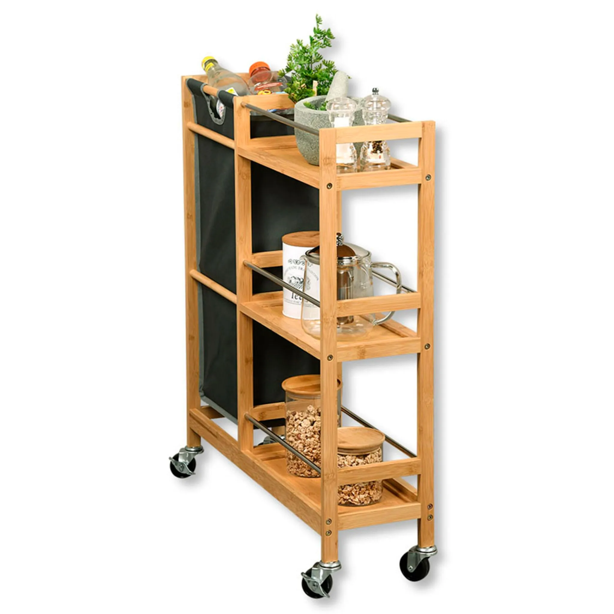 Полка-ниша с тремя полками Съемный сборник бутылок с ручкой. Мобильность благодаря 4 пластиковым колесам. Для компактного хранения кухонных принадлежностей. Изготовлен из бамбука, сертифицированного FSC.