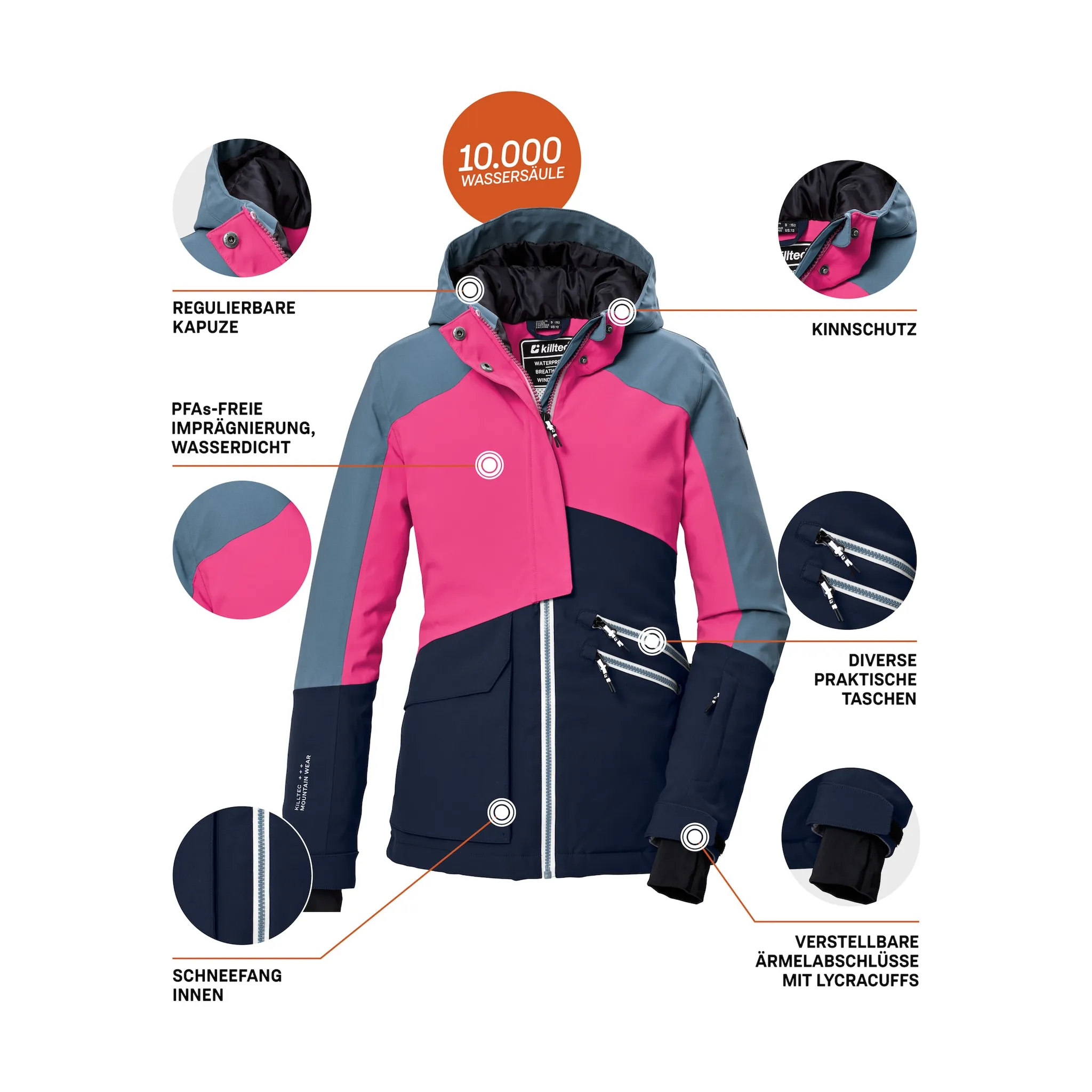Функциональная куртка для девочек с капюшоном и снегозадержателем от killtec сочетает в себе стиль и функциональность. Дышащий полиуретановый ламинат обеспечивает паропроницаемость 3000 г/м²/24 часа, а водяной столб 10 000 мм и сварные швы обеспечивают водонепроницаемость. Куртка впечатляет манжетами из лайкры и отверстиями для большого пальца, а также регулируемыми манжетами для индивидуального комфорта. Дышащие свойства обеспечивают приятный климат, чему способствуют сетчатые вставки и удобная внутренняя подкладка. Благодаря модному дизайну колор-блок и оптимальной посадке куртка не только функциональна, но и стильна. Защита подбородка на молнии, подол со шнурком для регулировки ширины и практичный внутренний карман подчеркивают продуманность деталей. Карман для ски-пасса и передний карман обеспечивают дополнительное место для хранения вещей.