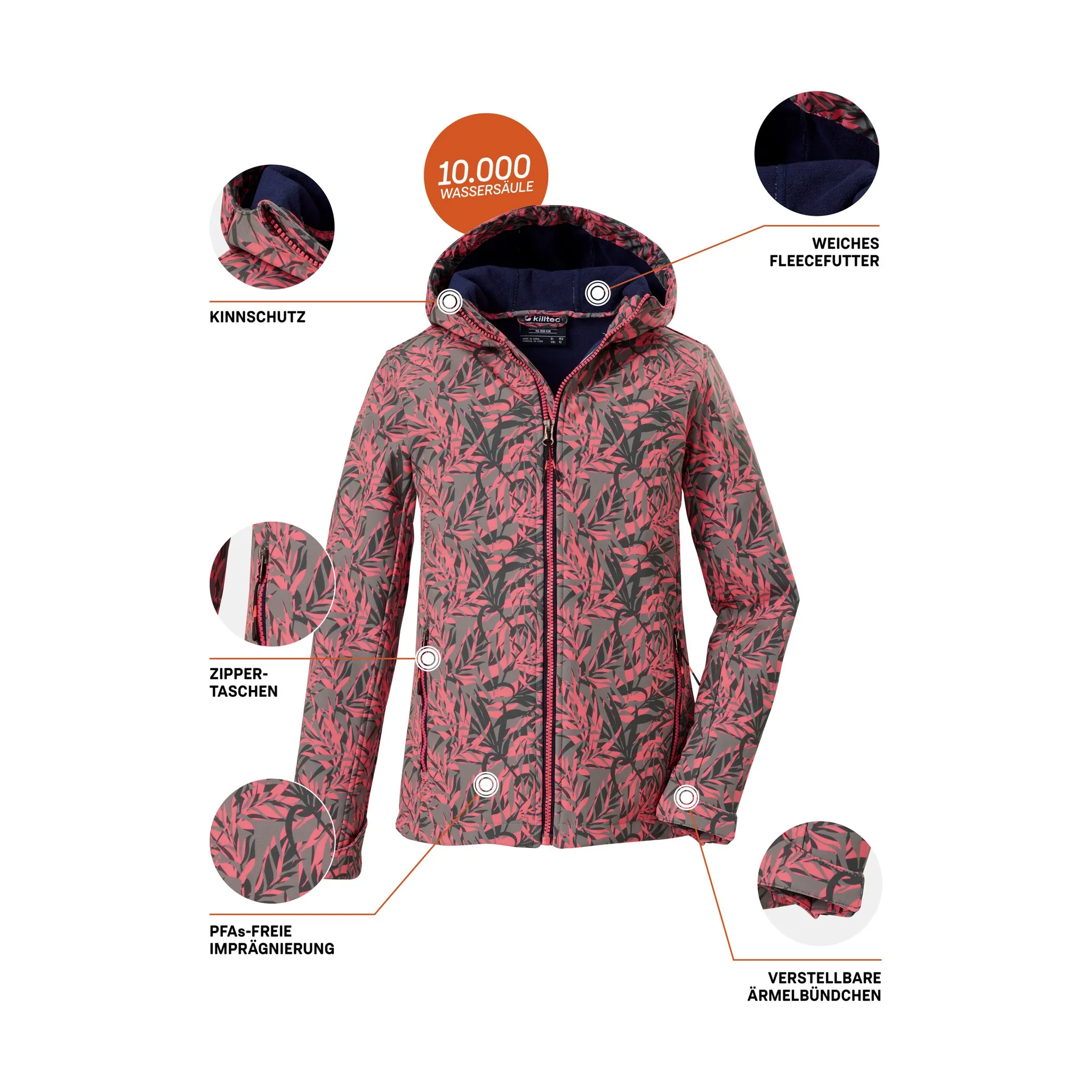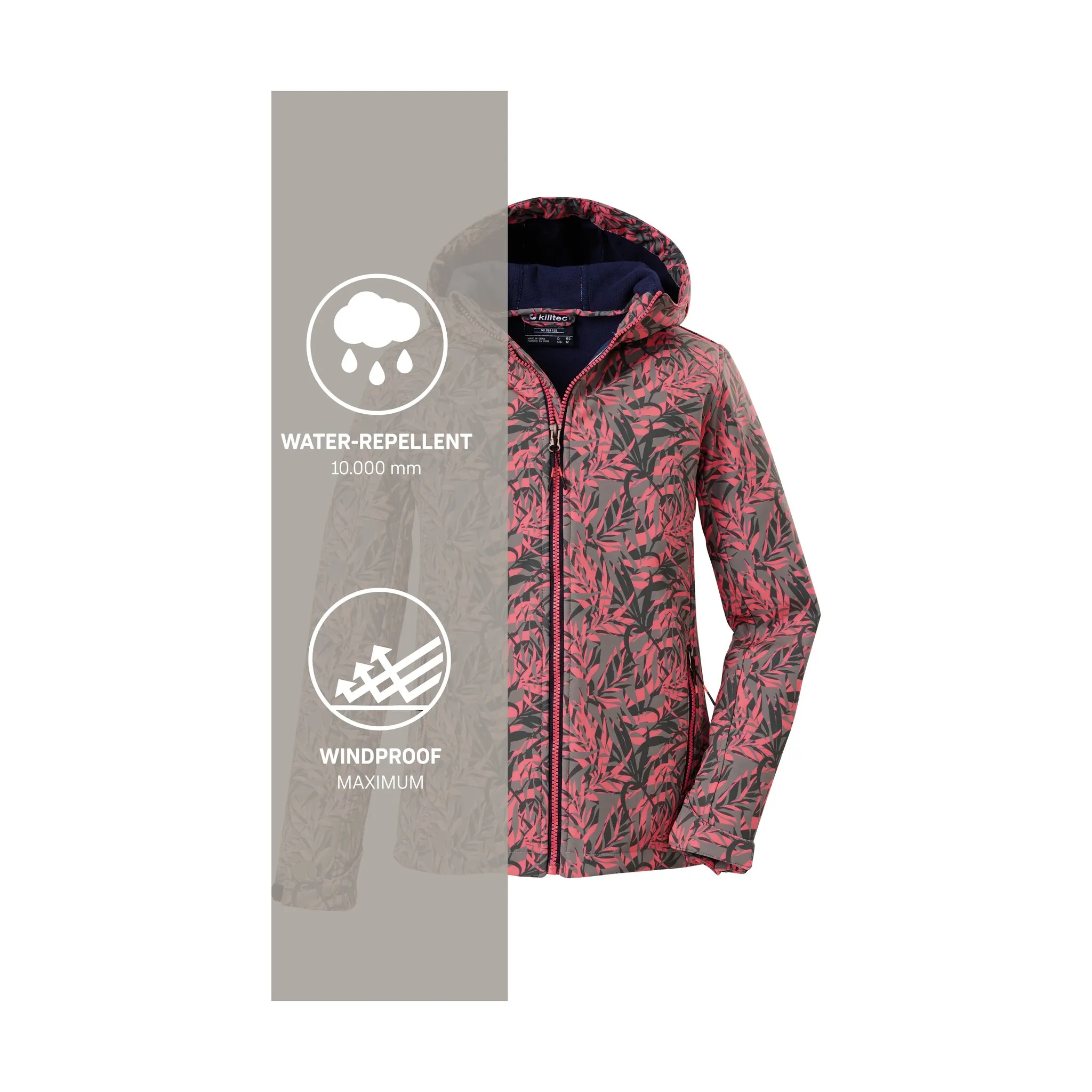 Куртка софтшелл с капюшоном для девочки от killtec сочетает в себе функциональность и стиль. Высококачественный полиуретановый ламинат с водяным столбом 10 000 мм обеспечивает надежную водо- и ветроотталкивающую способность куртки. Идеально подходит для переходного периода, обеспечивает надежную защиту от ветра и небольшого дождя. Защита подбородка на передней молнии предотвращает защемление кожи, а подол с кулиской позволяет удобно регулировать ширину. Куртка софтшелл впечатляет не только своими функциональными свойствами, но и продуманностью деталей и модным принтом. Использование сетки обеспечивает оптимальную воздухопроницаемость, а теплый флис на спине и флисовая вставка на капюшоне обеспечивают комфортное тепло. Для killtec особенно важно сделать коллекции более устойчивыми и ориентированными на будущее. killtec все больше полагается на более ответственные производственные процессы. Поэтому эта куртка пропитана без ПФАС.