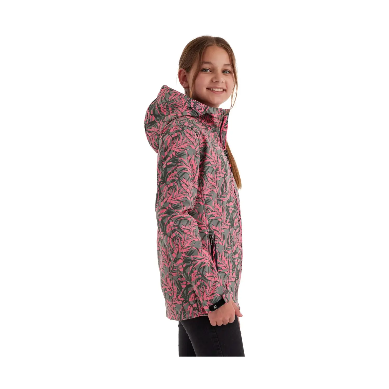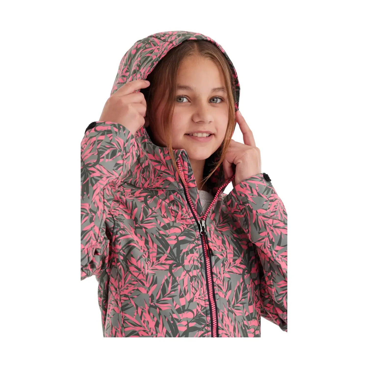 Куртка софтшелл для девочки с капюшоном и модным принтом. Водяной столб 10 000 мм, водоотталкивающий. регулируемые манжеты Внутри мягкий флис. Гидроизоляция без ПФАС – польза для вас и окружающей среды