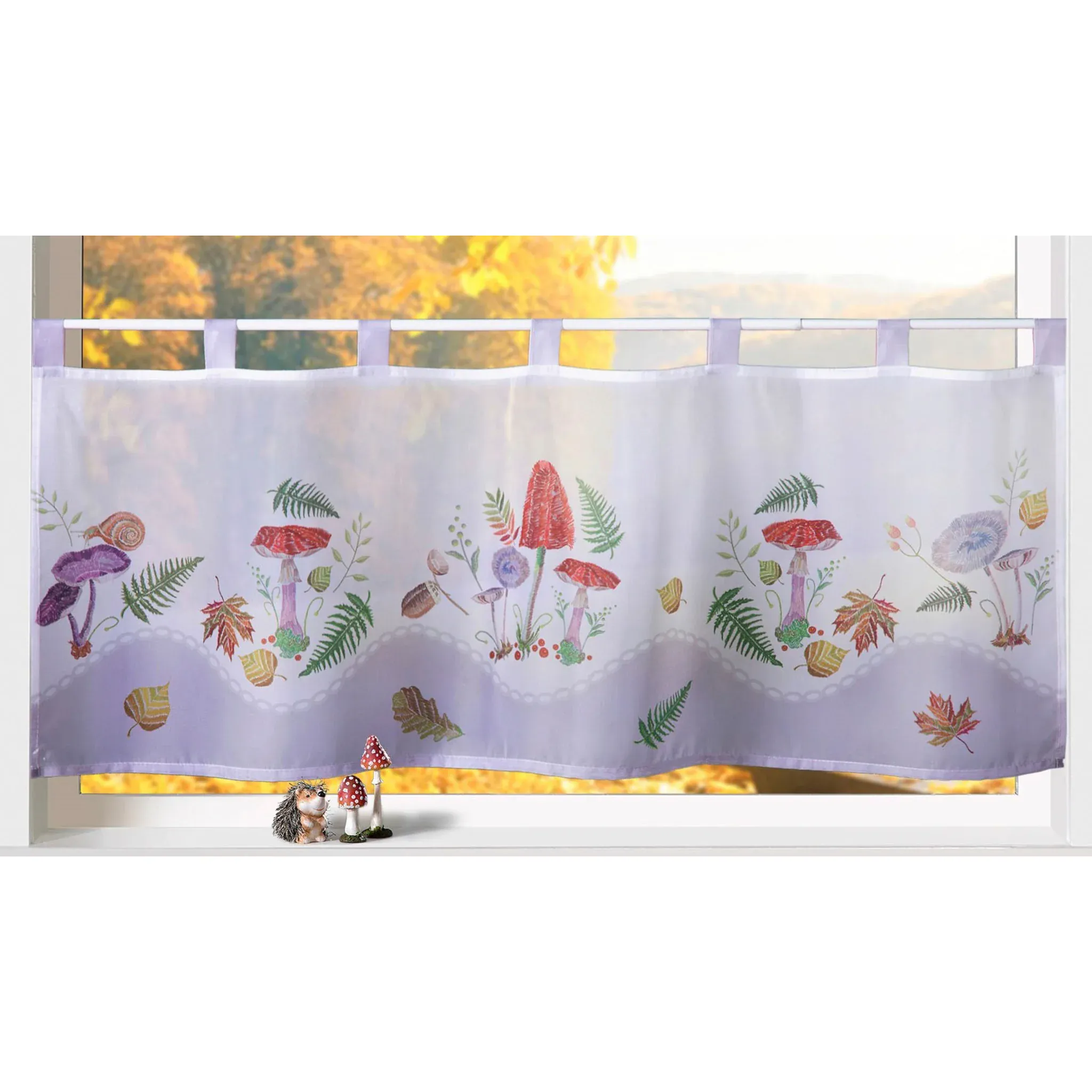 Панельная штора Silvan от Weckbrodt-Gardinen позволит золотой осени проникнуть в ваше жилое пространство. Имеет блестящий цветной принт с грибами и листьями на мягкой струящейся вуали. Панельная шторка прозрачна, но при этом обеспечивает тонкую защиту конфиденциальности. Он имеет 7 петель и подходит для карнизов диаметром до 21 мм, зажимных стержней и витрин. Ширина украшения 80-120см. Панельная штора изготовлена из 100% полиэстера, за ней легко ухаживать, ее можно стирать при температуре до 30°С в деликатном режиме.