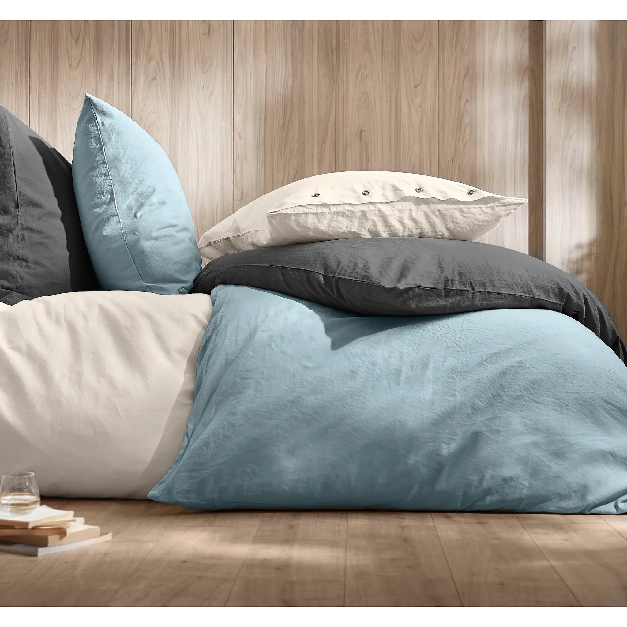 Льняная смесь Современные, привлекательные цвета, изготовлены из 30 % льна и 70 % хлопка. С качественными деревянными пуговицами и вышивкой логотипа на подушке.