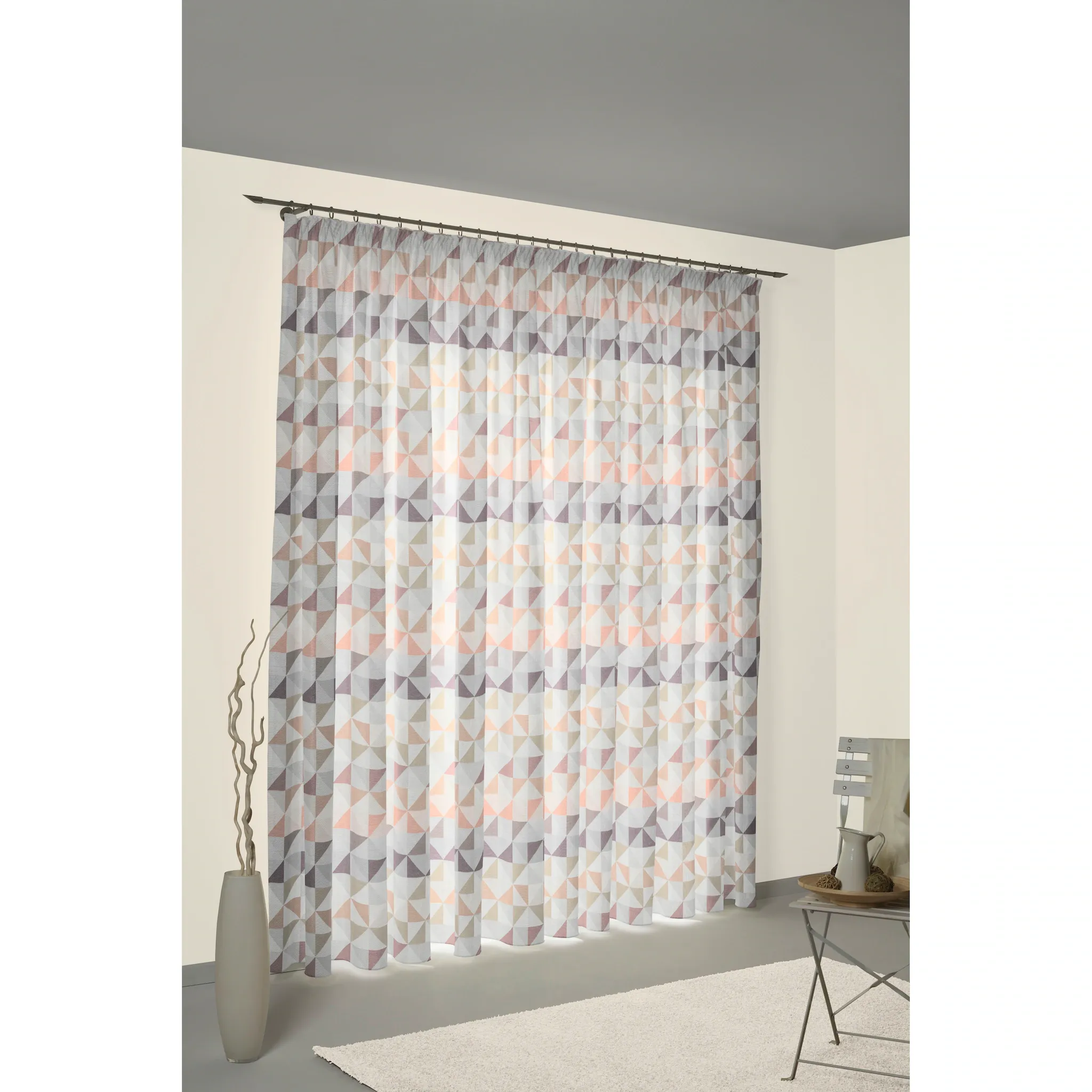 Ткань с тонкой, гладкой поверхностью. Непрозрачные ткани слегка темнеют и закрывают обзор снаружи. Ткани с рисунками расставляют акценты и идеально дополняются однотонными тканями. Производство Германия, непрозрачная ткань, геометрический рисунок, простота в уходе.