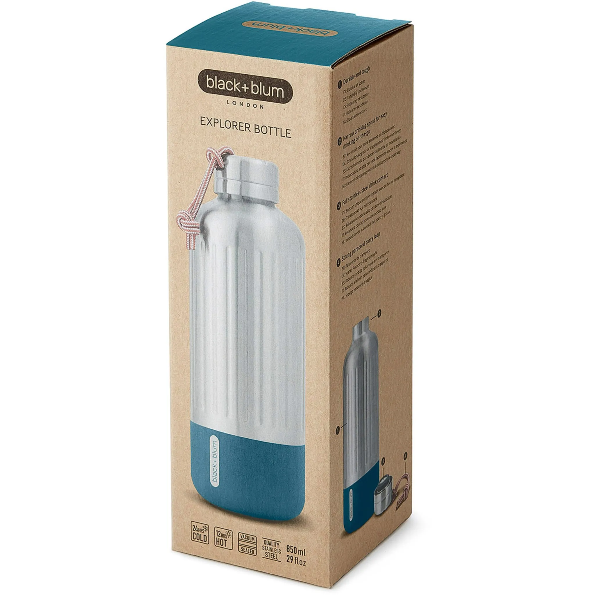 Эта изолированная бутылка из высококачественной нержавеющей стали привлекательного дизайна создана для искателей приключений. Разработанный для самых суровых условий, он сохраняет напитки холодными до 24 часов или горячими до 12 часов. Вакуумные бутылки гарантированно на 100% герметичны. Большое отверстие позволяет легко добавлять кубики льда или кусочки фруктов, а гладкий край с внутренней резьбой делает питье удовольствием. Эта бутылка имеет прочный ремешок из паракорда, предназначена для использования на открытом воздухе и может прослужить всю жизнь. Black+Blum создает качественную, стильную и оригинальную продукцию для повседневного использования.