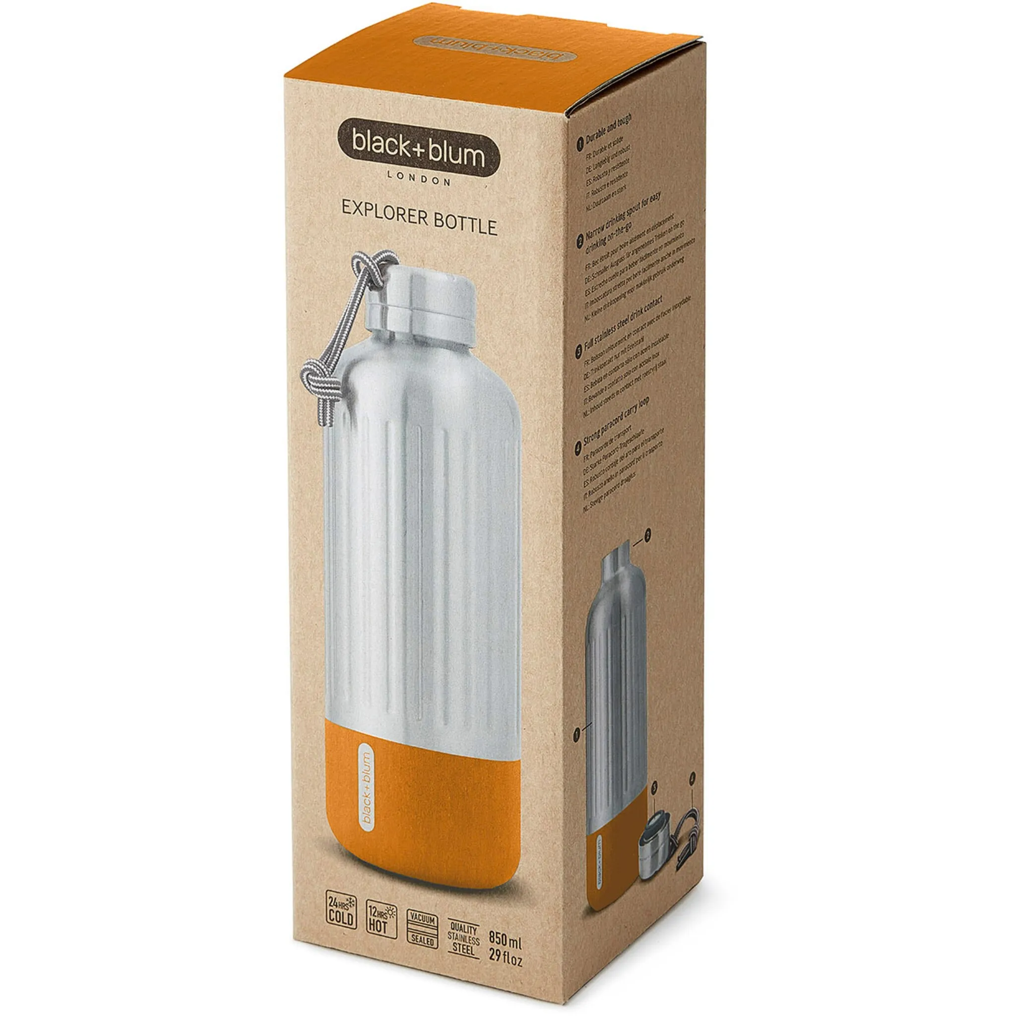 Эта изолированная бутылка из высококачественной нержавеющей стали привлекательного дизайна создана для искателей приключений. Разработанный для самых суровых условий, он сохраняет напитки холодными до 24 часов или горячими до 12 часов. Вакуумные бутылки гарантированно на 100% герметичны. Большое отверстие позволяет легко добавлять кубики льда или кусочки фруктов, а гладкий край с внутренней резьбой делает питье удовольствием. Эта бутылка имеет прочный ремешок из паракорда, предназначена для использования на открытом воздухе и может прослужить всю жизнь. Black+Blum создает качественную, стильную и оригинальную продукцию для повседневного использования.