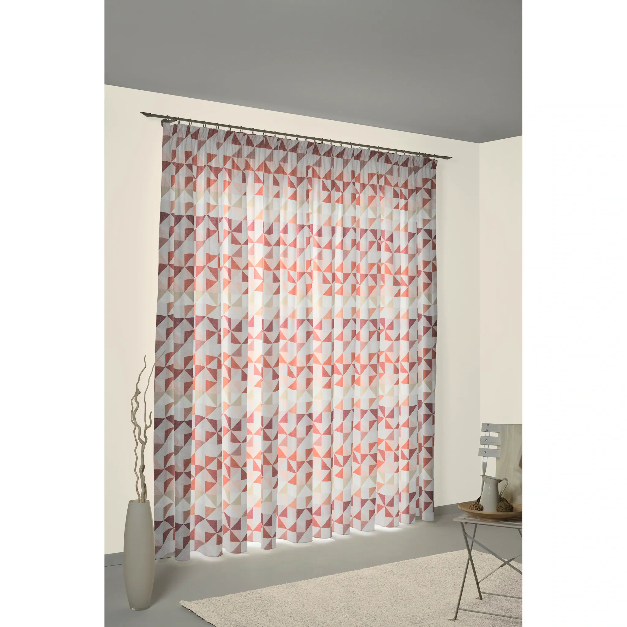 Ткань с тонкой, гладкой поверхностью. Непрозрачные ткани слегка темнеют и закрывают обзор снаружи. Ткани с рисунками расставляют акценты и идеально дополняются однотонными тканями. Производство Германия, непрозрачная ткань, геометрический рисунок, простота в уходе.