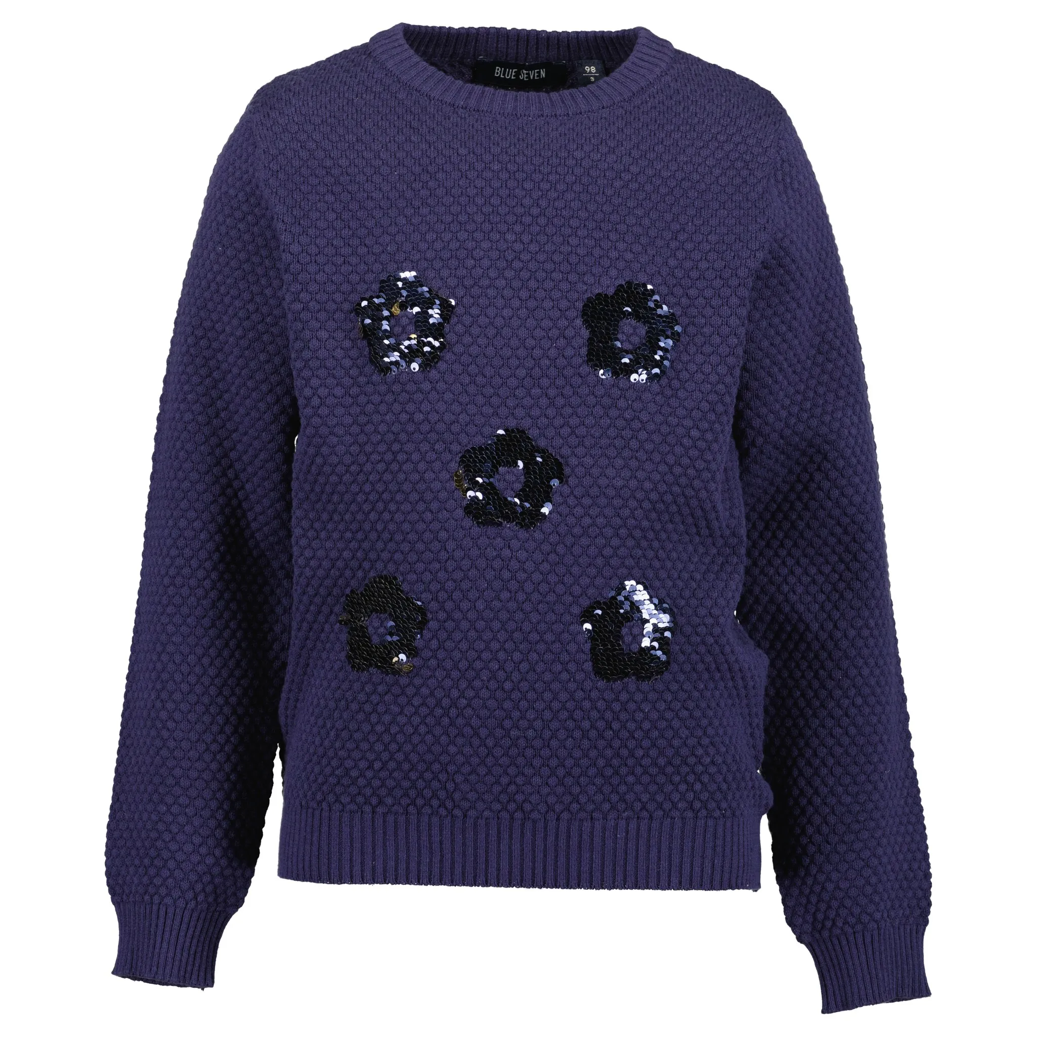 Актуальный свитер с круглым вырезом для девочек от Blue Seven. Рукава длинные. Он украшен блестящими современными пайетками. Благодаря эластичному трикотажу топ легко перемещается и сохраняет тепло.