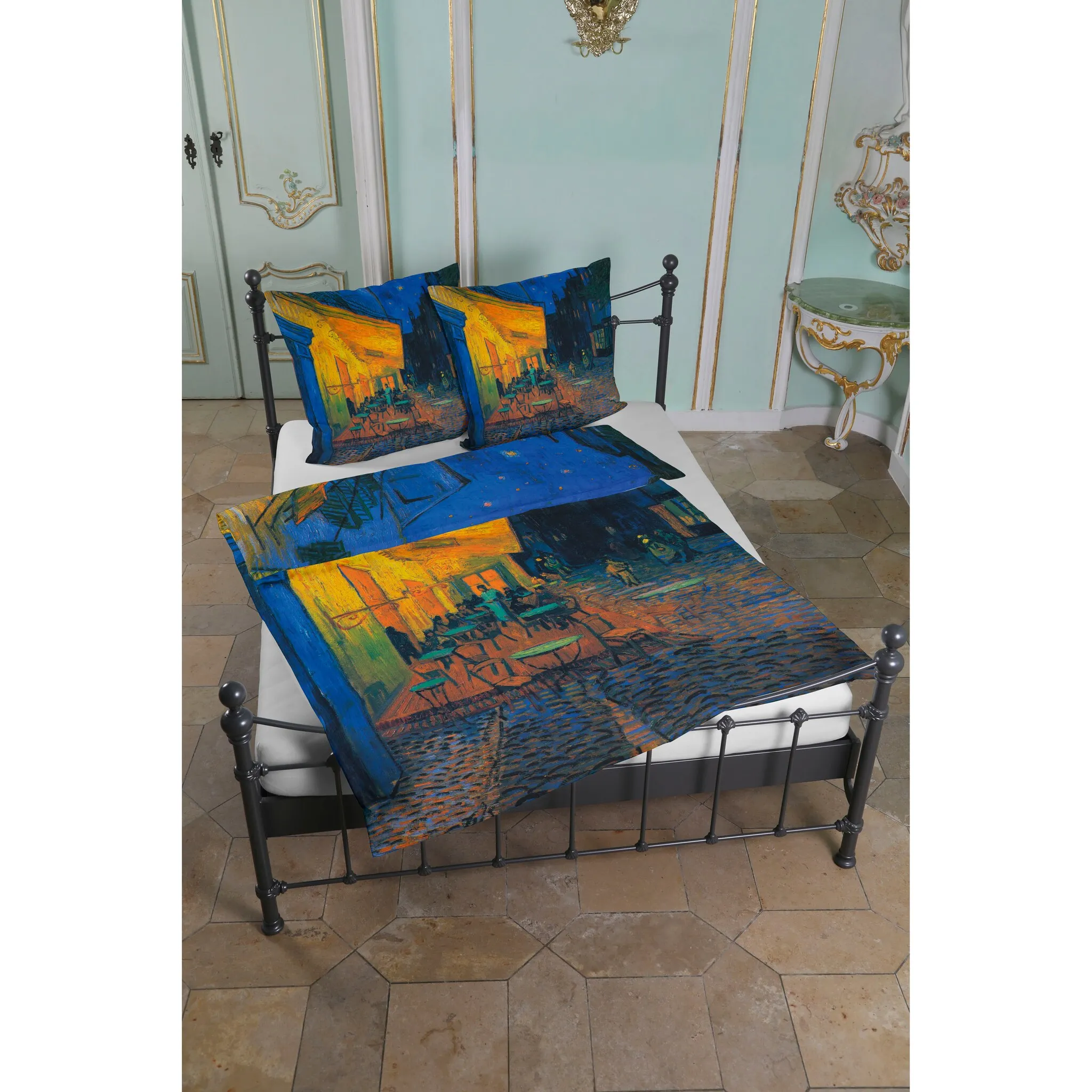 Картина маслом Винсента Ван Гога послужила шаблоном для этого необычного постельного белья «Ночное кафе» от GEOBEL. Контраст между холодными синими тонами и теплыми желтыми тонами доминирует в изображении. Сложный процесс цифровой печати позволяет реализовать яркость этих цветов. Это постельное белье станет изюминкой вашей спальни. Высококачественный сатин, изготовленный из 100% чистого хлопка, особенно приятен. Молнии, вшитые в наволочку и пододеяльник, практичны, поэтому смена постельного белья становится детской игрой. Чехлы можно стирать в машине и безопасно сушить в стиральной машине. Идеальный выбор для спокойных ночей.
