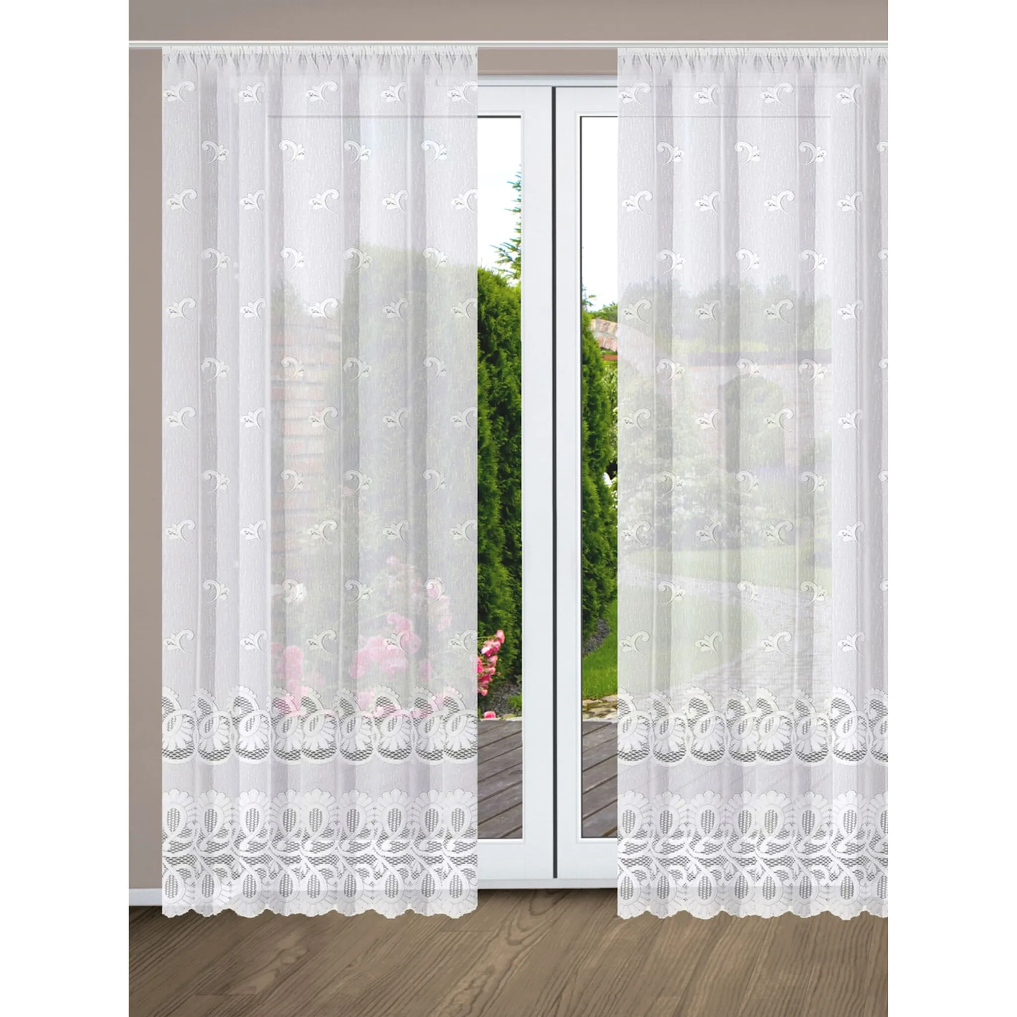 Dekostore Полупрозрачный жаккард с элегантным тканым узором и изогнутой отделкой. Лента-плиссе делает штору визуально более открытой и прозрачной. 100% полиэстер. Бережная стирка при температуре до 30°C.