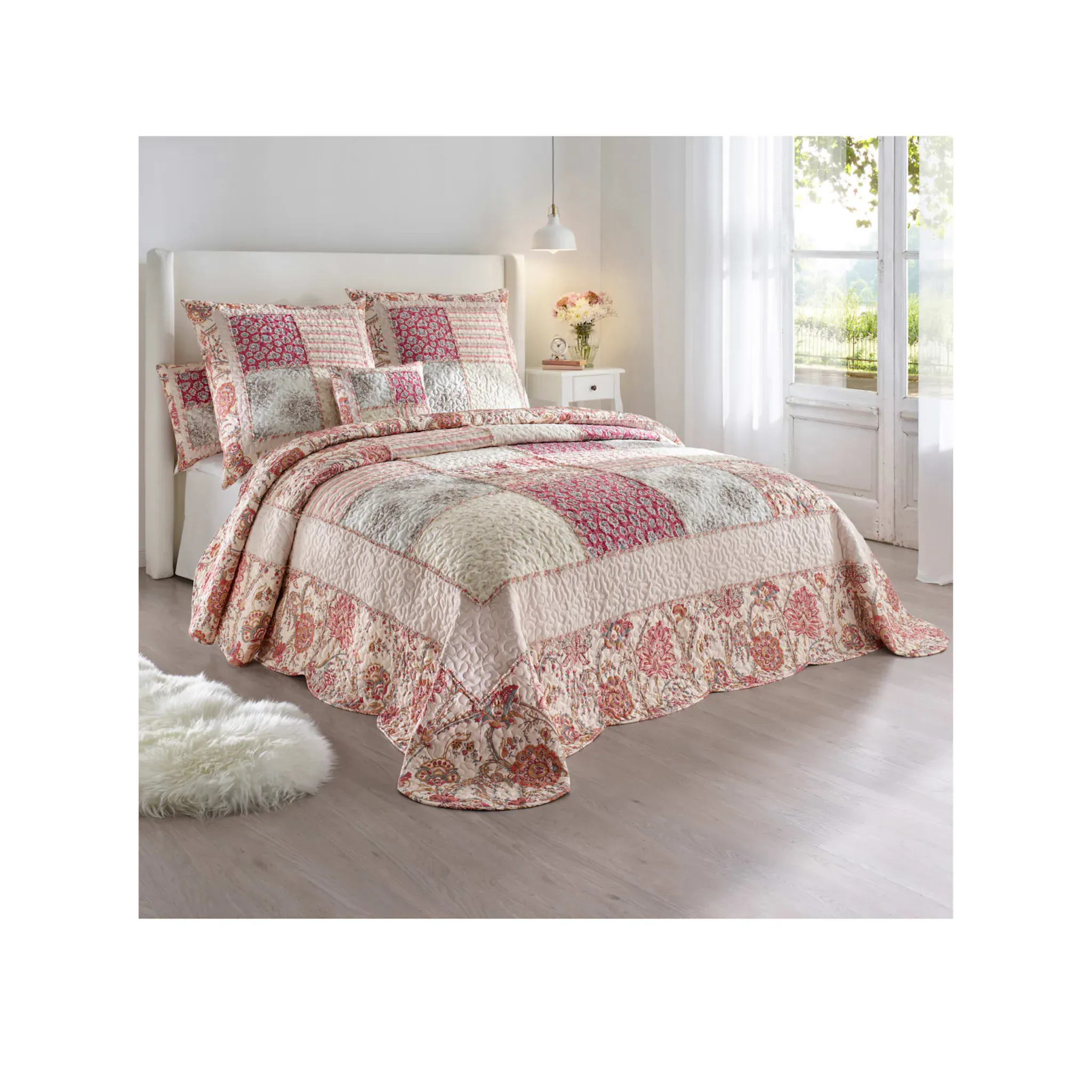 Покрывало спереди выполнено в технике лоскутного шитья, с пришитыми рюшами. Возвращение к высококачественной цифровой печати. По всей поверхности красивая декоративная стежка. Одеяло на легкой подкладке, с закругленным краем. Чехол на подушку со потайной молнией. 100% полиэстер. Машинная стирка до 30°С.