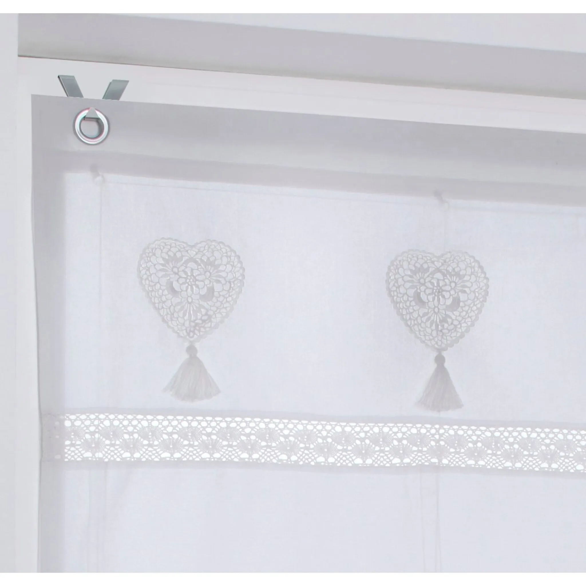 Римские шторы Непрозрачного качества с романтической вышивкой в ​​виде сердечек, кружевом, связанным крючком, и кисточкой. С петельками для удобного подвешивания на оконную раму. В комплект поставки входит крючок. Ширина 45-80 см: 2 крючка, ширина 100 см: 3 крючка. 100% хлопок. Моющийся.