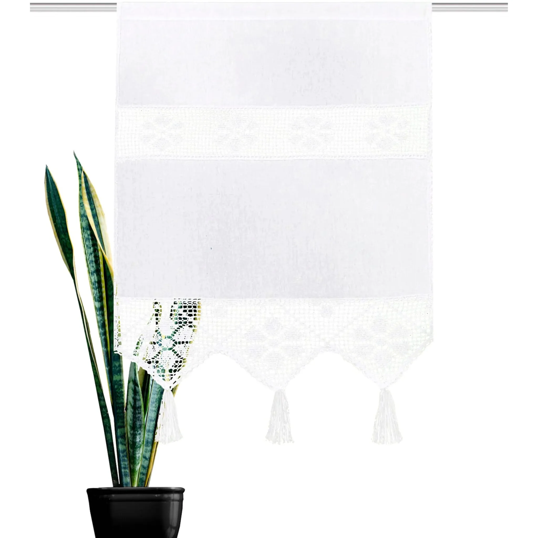 Подвеска на окно из непрозрачной ширмы со сложными прозрачными вставками, связанными крючком. Закончено кисточками. С проталкиванием стержня. 70% хлопок, 30% полиэстер. Моющийся.
