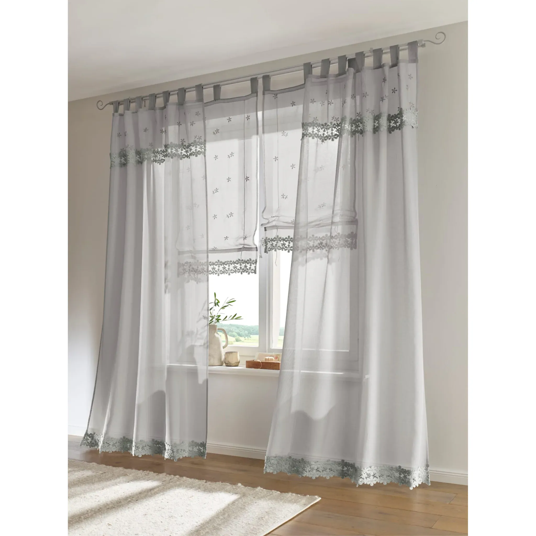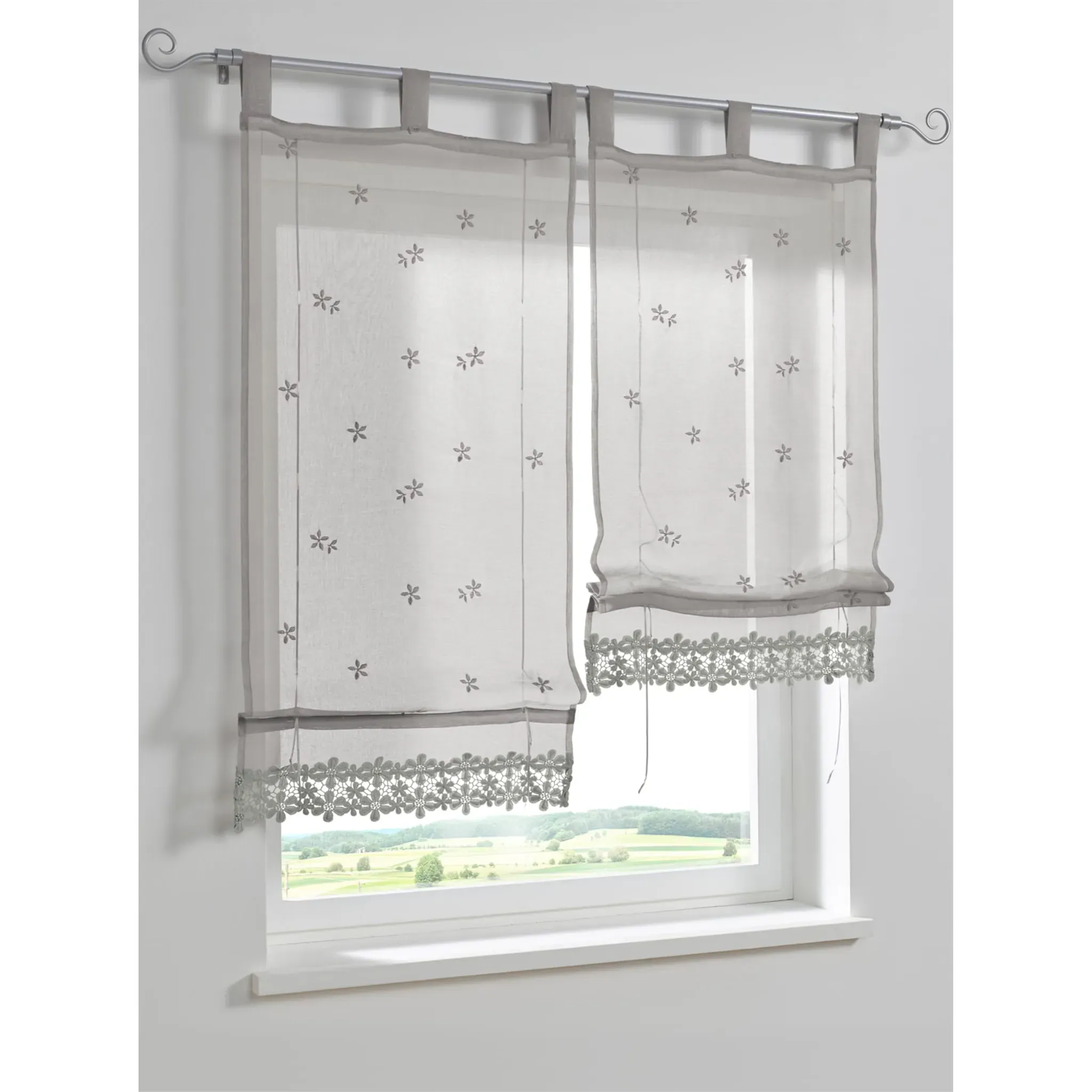Римская штора с изысканной цветочной вышивкой. Распечатано. Мягко струится. Полупрозрачный. Информация об измерениях в Интернете. 100% полиэстер. Моющийся.