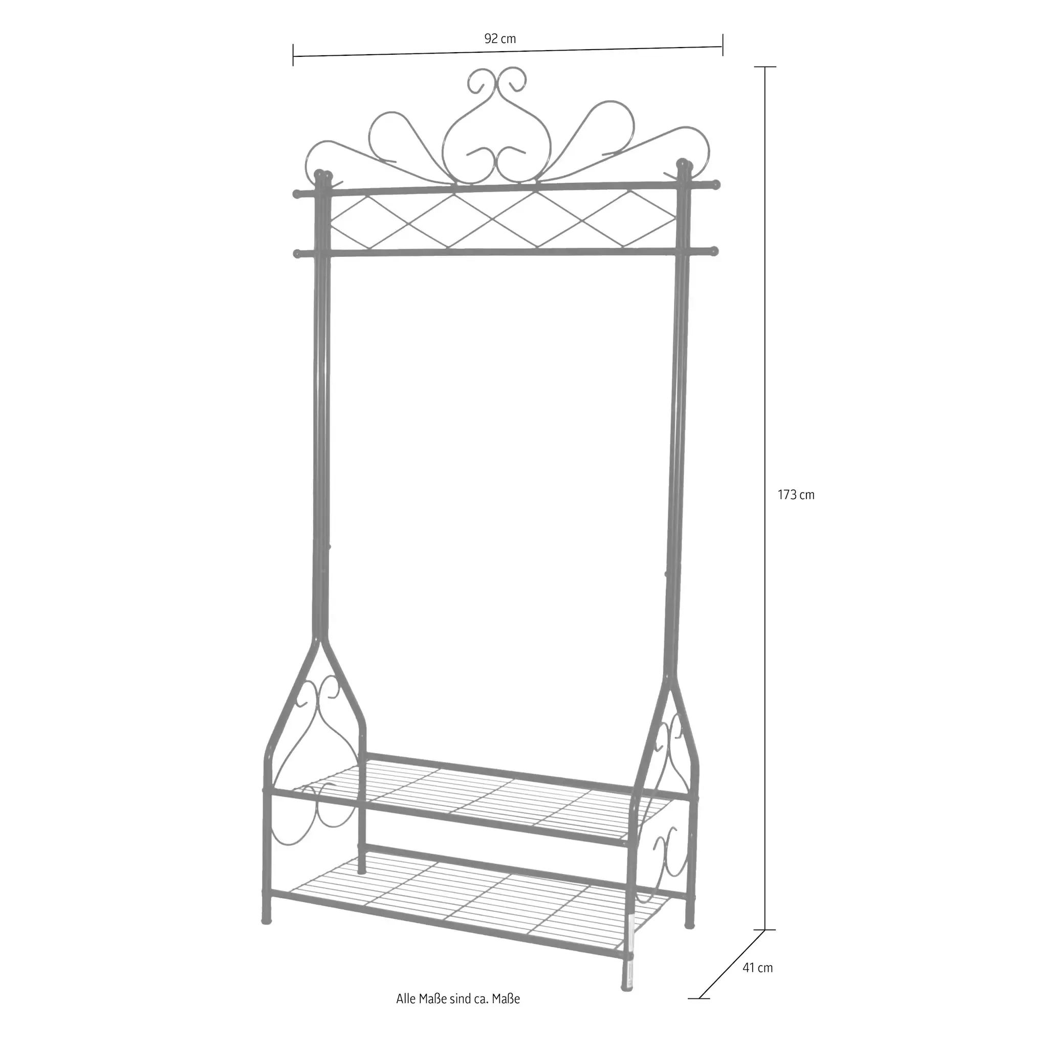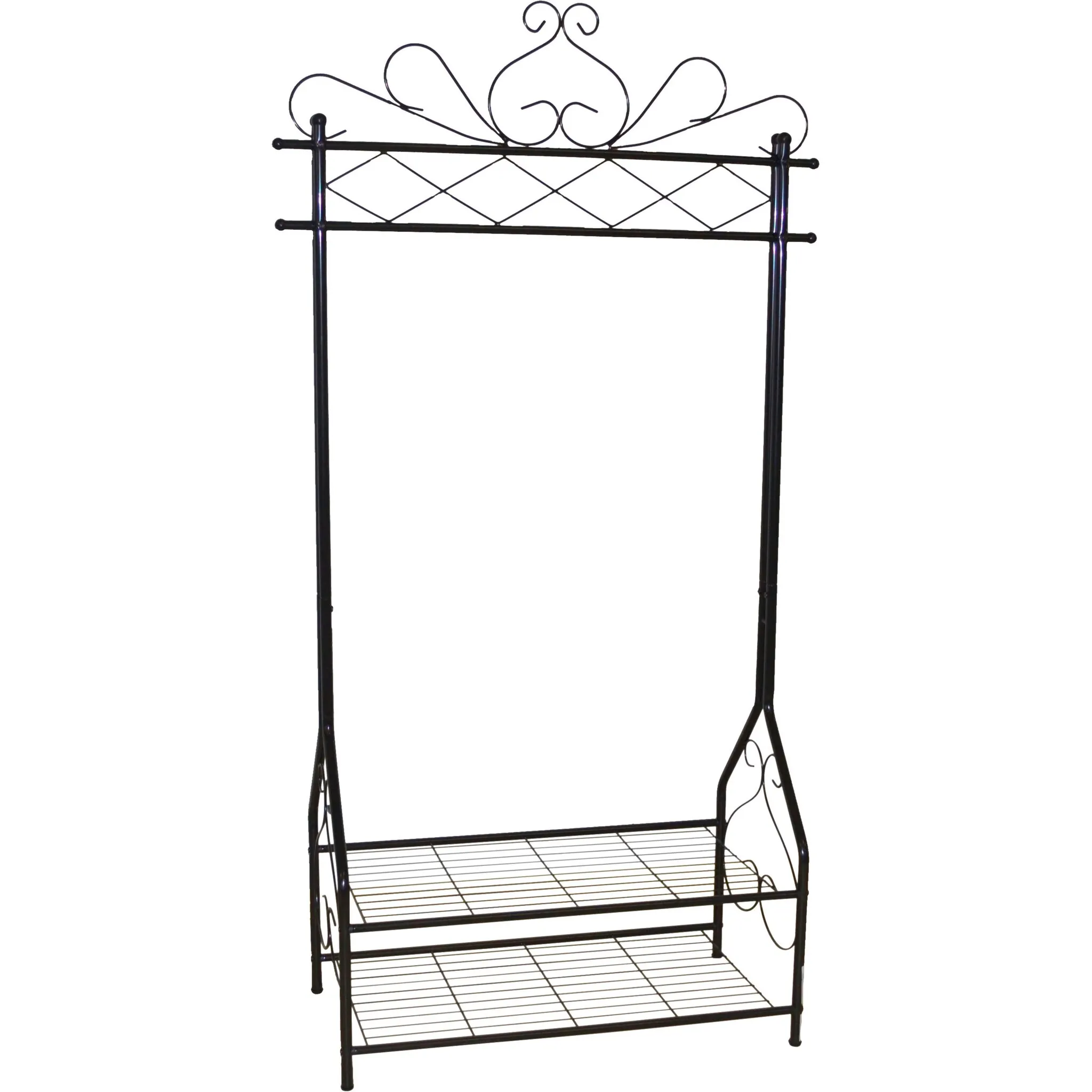 Романтическая вешалка для одежды с красивым декором, изготовлена ​​из стальной трубы и покрыта порошковой краской. Две проволочные полки внизу, штанга для одежды вверху. Справа/слева по два крючка.