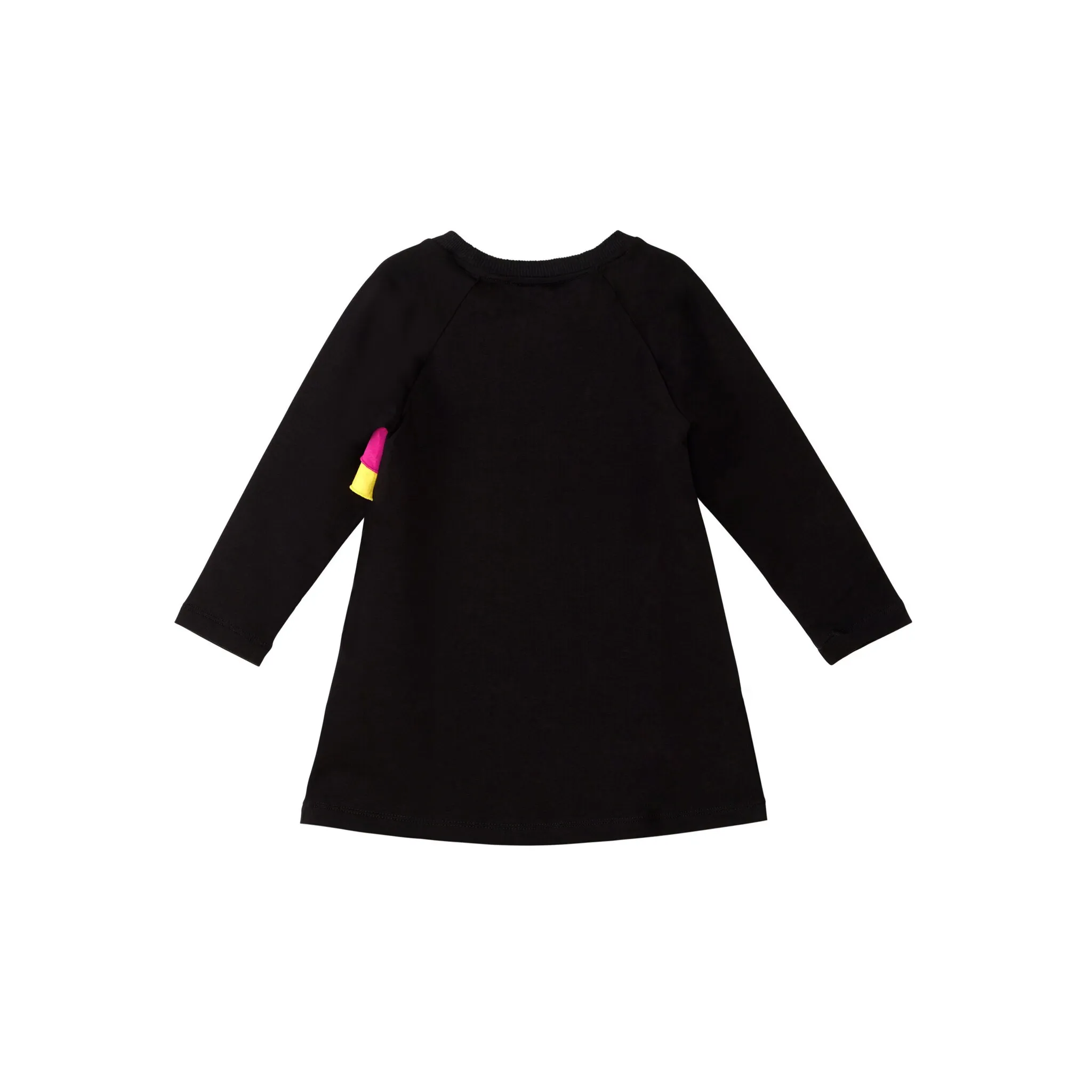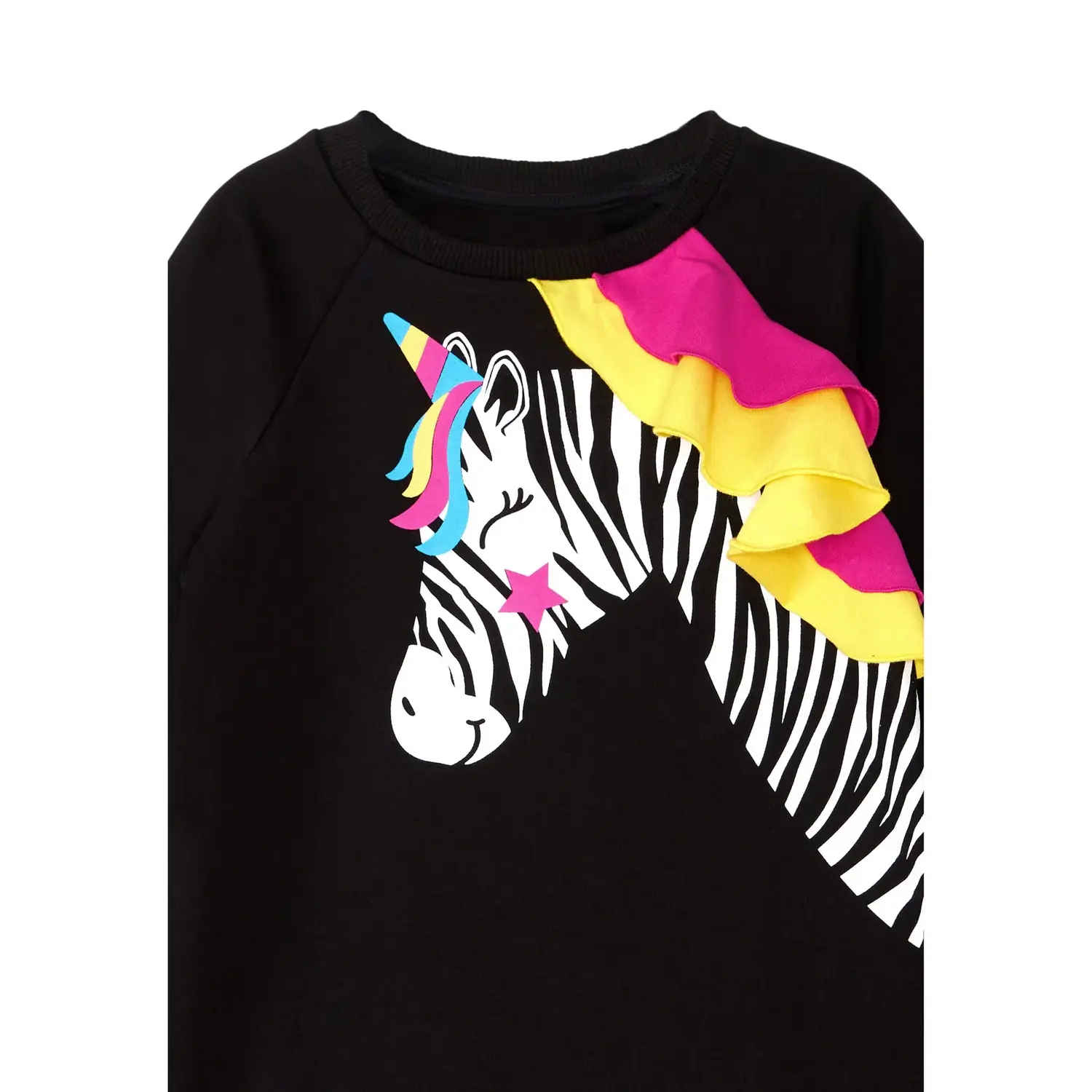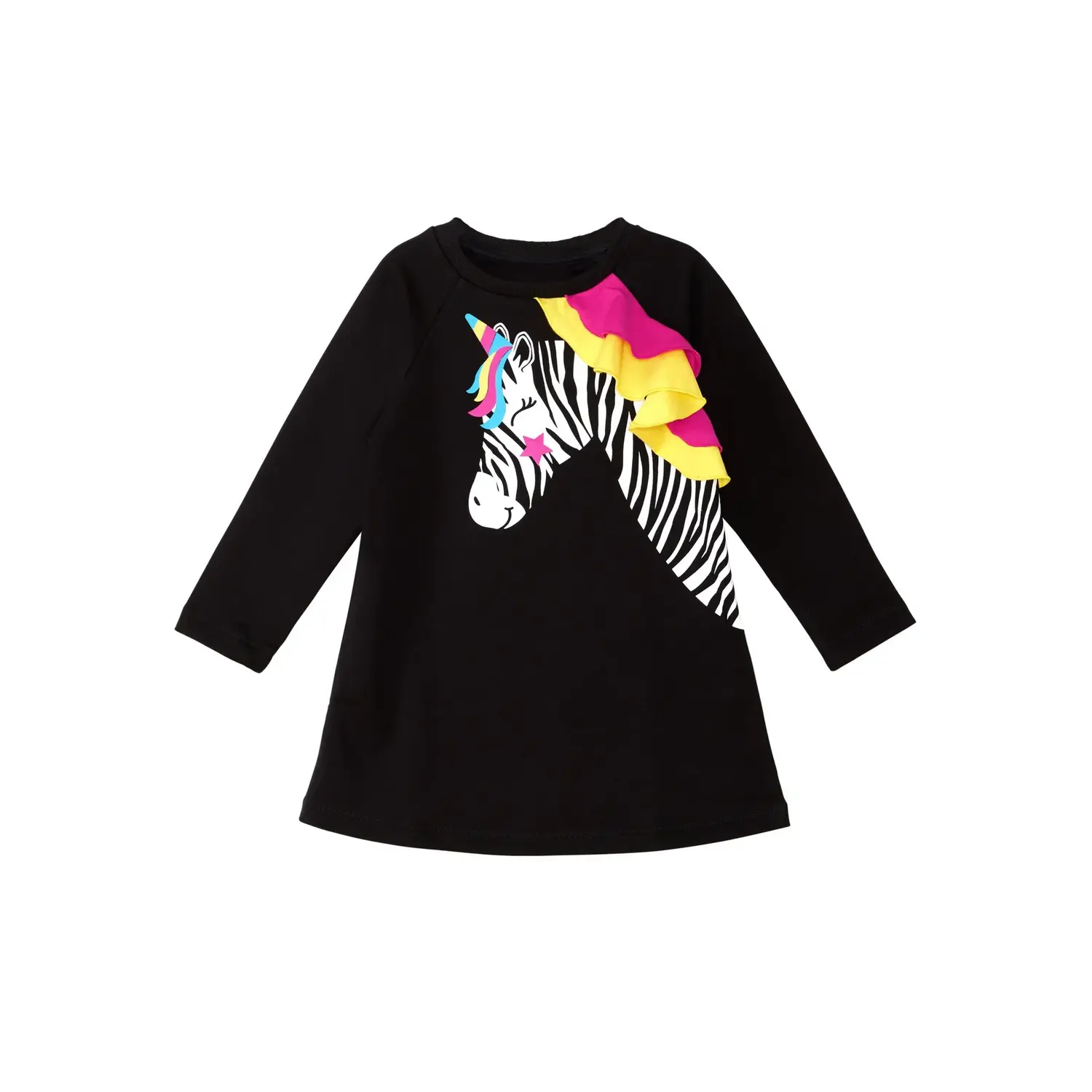 Платье с принтом единорога и зебры из хлопчатобумажной ткани средней толщины и рукавами реглан. Зебра носит двухслойную гриву с оборками. Если вы растете, рекомендуем брать на размер больше. Продукция Denokids производится с учетом безопасности детей.