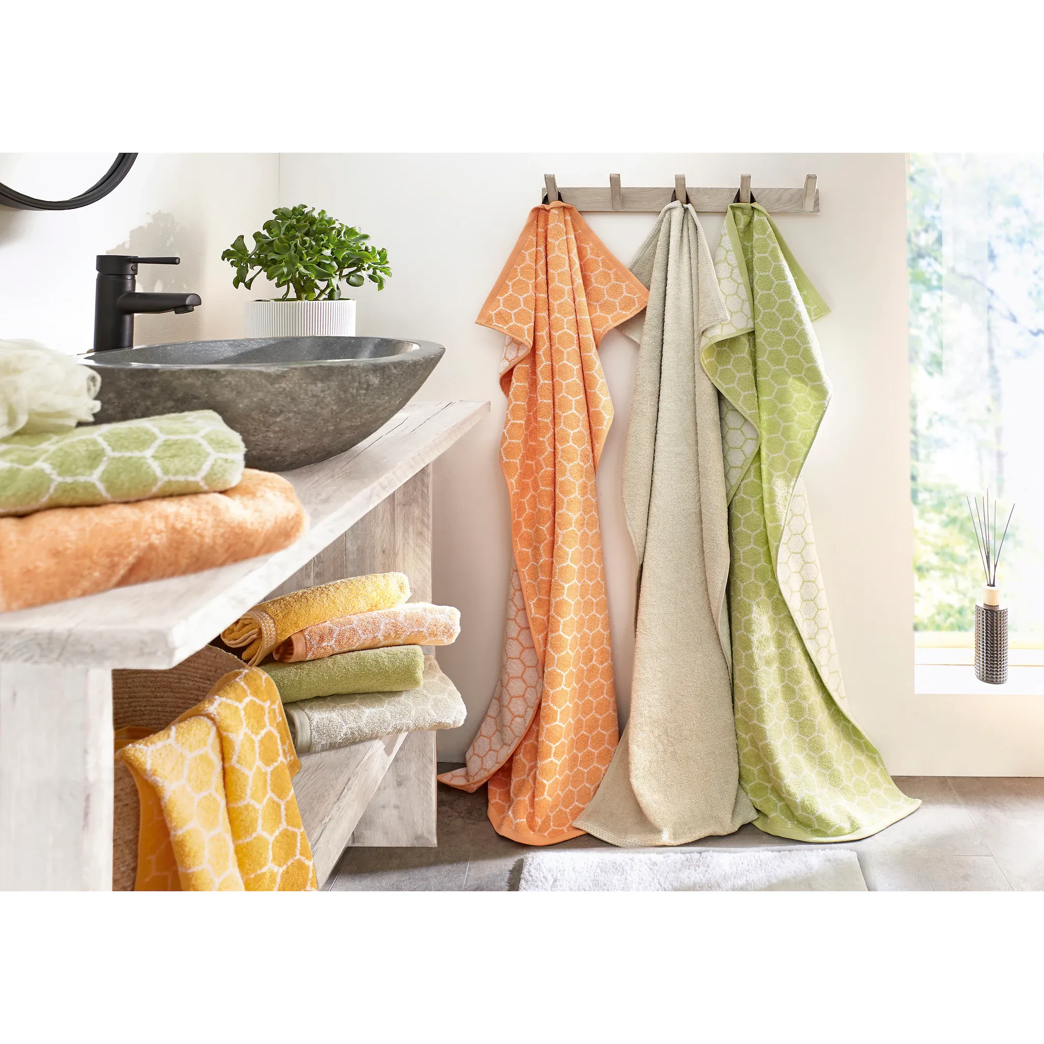 Эта модная махровая гамма качества RUBY впечатляет тонким узором и свежими цветами. Доступен в дизайне «МЕД» или «КОМБ». Узор в виде сот из дизайна HONEY уловлен в нижней части двусторонней однотонной ткани COMB, поэтому их можно чудесно комбинировать. РУБИН особенно пушистый, приятный на коже и в то же время обладает очень хорошими ухаживающими свойствами. Ткани имеют поверхностную плотность около 480 г/м². Полотенца прекрасно сочетаются с махровой серией Dyckhoff NATURE, если вы хотите добавить защитные перчатки, гостевые полотенца или коврики для ванной.
