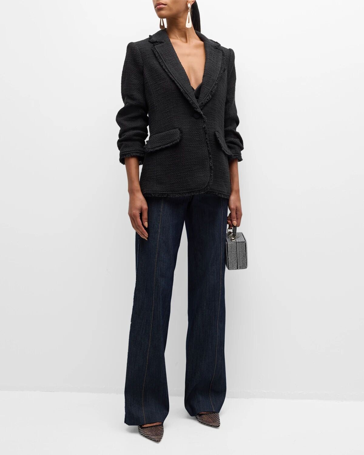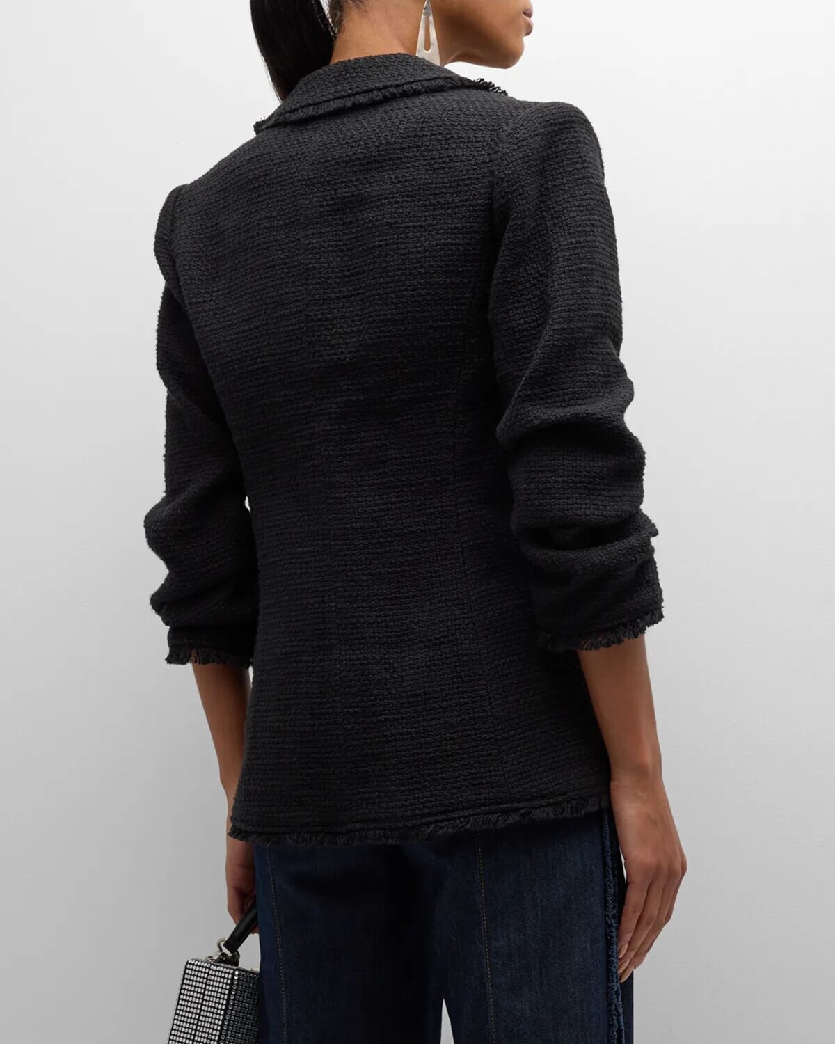 Современный твидовый пиджак классического кроя. Создайте современную изысканную атмосферу в этом стильном пиджаке-букле с присборенными рукавами и перьевой потертой отделкой.