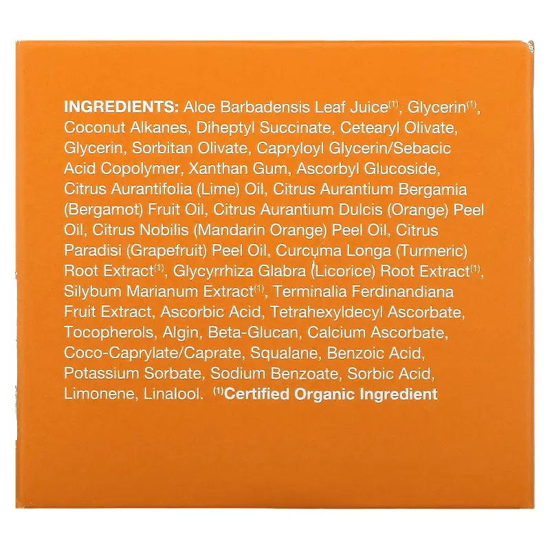 Алоэ Барбаденсис Сок листьев, глицерин, кокосовые алканы, дигиптил сукцинат, цетерилаливат, глицерин, сорбитан оливат, каприлойл глицерин/себак -сополимер, ксантановая жевательная резинка, аспекторная глюкозид, ауранта (лиама), азиорно -айтральная гимрайта, айтрийр -айтранка (лиама), а также глима -гимрайт, а также грума с глюкозидом, цитрусовой, азорбил -гимрайт, азорбил -гимрайт, азорбильный глим, а также грума с глима (Бергамот) Фруктовое масло, цитрусовый aurantium dulcis (оранжевый) масло кожура, цитрусовое нобилис (оранжевый мандарин), кожуровое масло, цитрусовый парадиси (грейпфрут) пили -масло, корневой экстракт грейпфрута), корневой экстракт глицирхиза (лакорет) корневой экстракт, корневой экстракт лакореции), корневой экстракт лакореции), корневой экстракт глицирхиза (лакорет), корневой экстракт глицирхиза (лакорет) корешка, экстракт силибума Мариана, фруктовый экстракт терминалов, аскорбиновую кислоту, тетрагексильдецил аскорбат, токоферолы, альгин, бета-глюкан, аскорбат кальция, коко-каприлат/капрат, квалан, бензойс кислота, потенциал, сор-капилат, натеняновый, натенильный бенз. сорбиновая кислота, лимонен, линалоол.