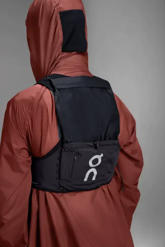 Легкий, настраиваемый, 10-литровый жилет для бега по пересеченной местности на длинные дистанции. Включает две фляги Hydrapak по 500 мл и место для питьевого резервуара.