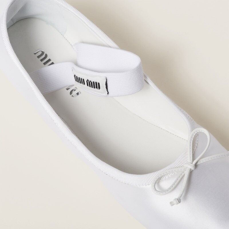 Легендарная модель из коллекций Miu Miu, представленных на показе осень/зима 2022. Эти балетки имеют оригинальный атласный дизайн, дополненный очень женственными деталями, такими как бант и резинка с логотипом.
