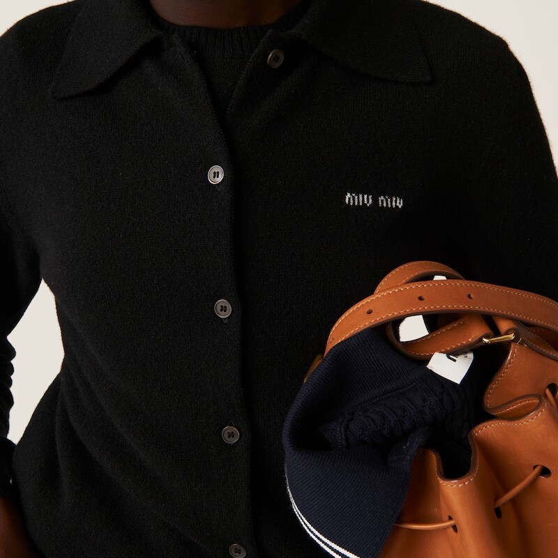 Кардиган из мягкого кашемира с рубашечным воротником. Логотип интарсии придает культовый вид.