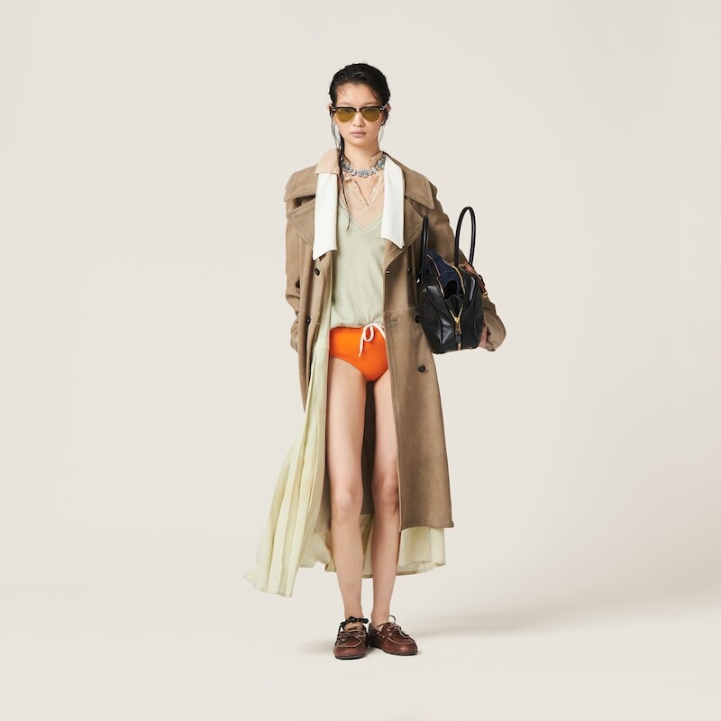 Этот купальник, ставший одним из центральных элементов показа мод весна-лето 24, был задуман как неотъемлемая часть нарядов. Он украшен вышитым логотипом, который придает ему культовый вид.