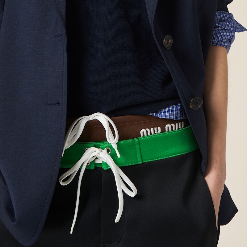 Этот купальник, ставший одним из центральных элементов показа мод весна-лето 24, был задуман как неотъемлемая часть нарядов. Он украшен вышитым логотипом, который придает ему культовый вид.