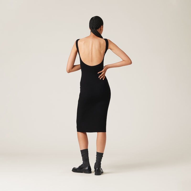 Это новое платье элегантных линий воплощает культовый и смелый стиль Miu Miu. Платье-футляр, обычно пропитанное формальной элегантностью, приобретает спортивный дух в этом трикотажном варианте в рубчик, украшенном логотипом интарсии контрастного цвета, который придает особый акцент.