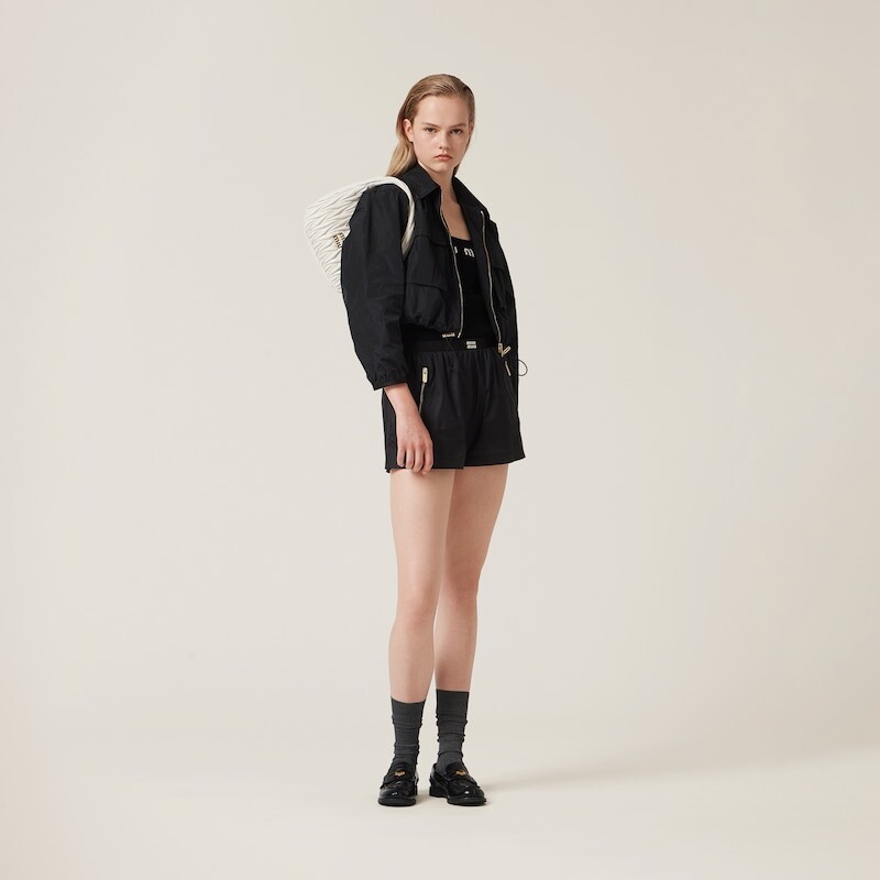 Узор интарсия представляет собой новую интерпретацию культового логотипа Miu Miu. Ребристая вязка подчеркивает приталенный крой топа.