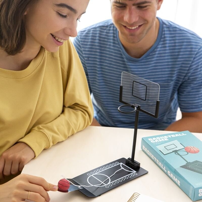 Игра в баскетбол в мини-версии, складная. Возьмите мяч, поместите его в центр рычага, нажмите пальцем и отпустите, чтобы мяч подпрыгнул. Побеждает тот, кто попадет в корзину большее количество раз! Отличное развлечение для всей семьи. Проверьте, у кого лучший гол. Игра небольшая, поэтому ее можно везде брать с собой. Он станет идеальным подарком любителю аркадных игр. Будет способствовать развитию координации, моторики и логического мышления.