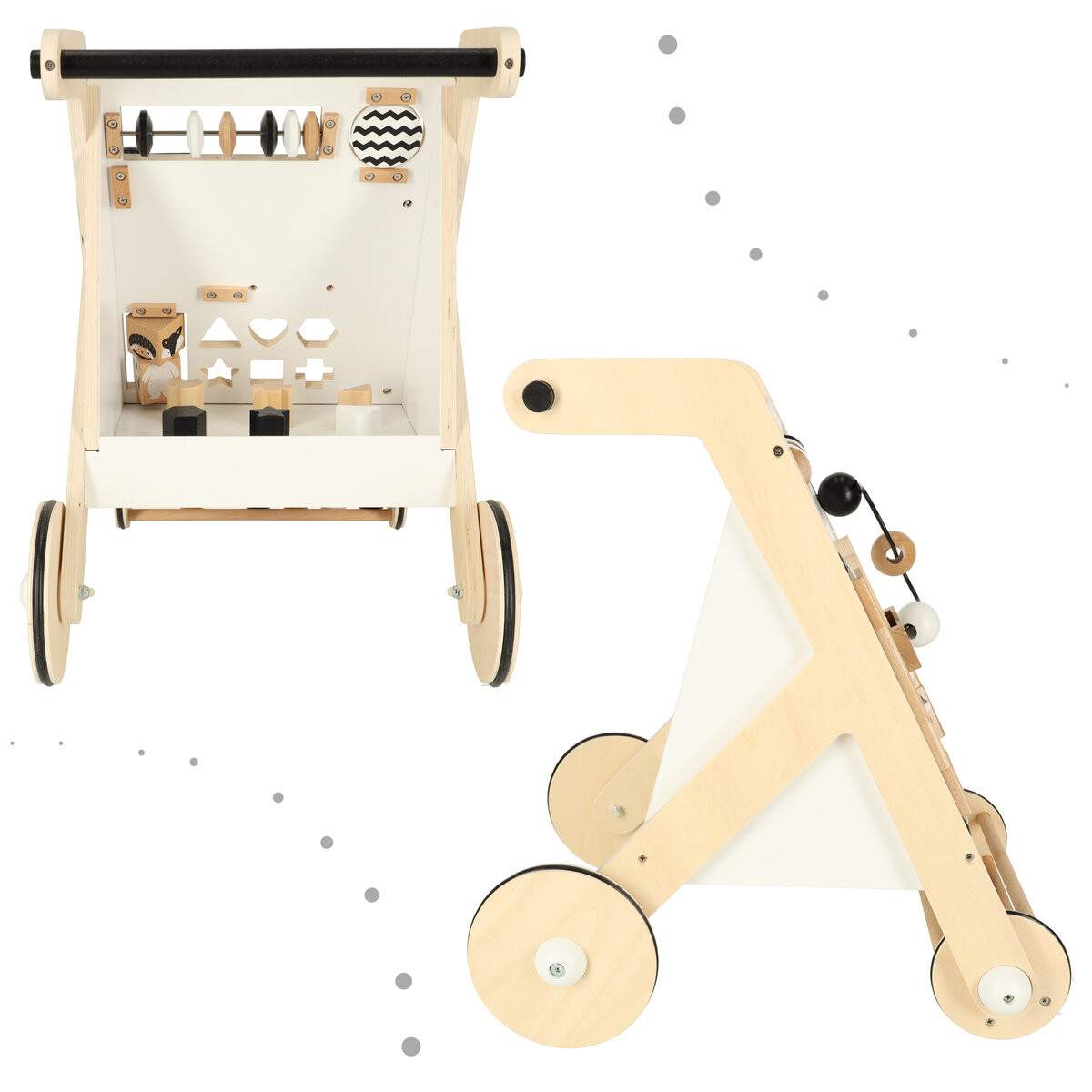 Ходунки, помимо того, что будут опорой при обучении ходьбе, будут также быть обучающей игрушкой. Многочисленные интерактивные элементы надолго займут вашего малыша, не только развлекая его, но и обучая многим необходимым навыкам. Деревянная толкатель обязательно станет любимой игрушкой вашего ребенка!БОЛЬШОЕ КОЛИЧЕСТВО ЭЛЕМЕНТОВ