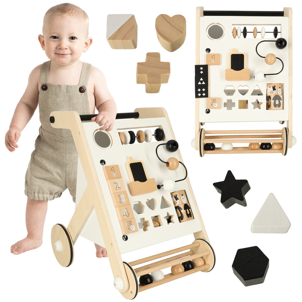 Простые занятия, предлагаемые ходунками, не только доставляют вашему малышу массу развлечений, но и способствуют развитию навыков, необходимых для правильного развития. Перемещение деревянных плиток или сортировка кубиков – занятие, которое непременно положительно скажется на ручных навыках – мелкой моторике и точности рук и пальцев. Кроме того, цифровая маркировка на плитках знакомит малыша с цифрами от 1 до 5.ВЕСЕЛЬЕ И ОБУЧЕНИЕ — 2В1!