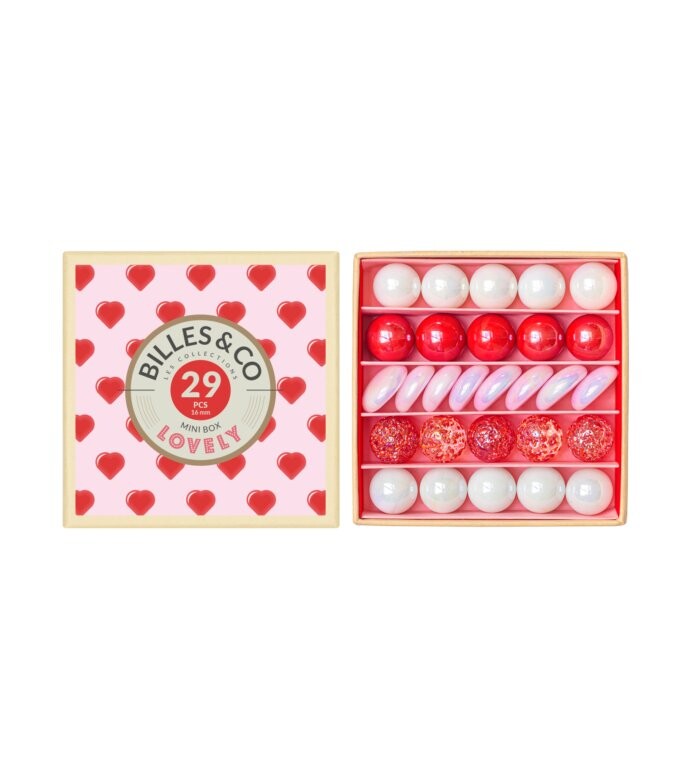Billes&Co HEART — это набор из 29 стеклянных шариков и камней, разложенных в разные цвета, в красиво оформленной коробке. Различные цвета, текстуры и узоры шаров обладают гипнотизирующей силой, которая не даст вам скучать. Шары расположены тематически, создавая в небольших коробочках уникальные вселенные.