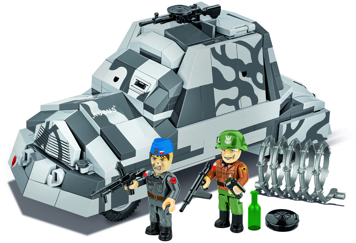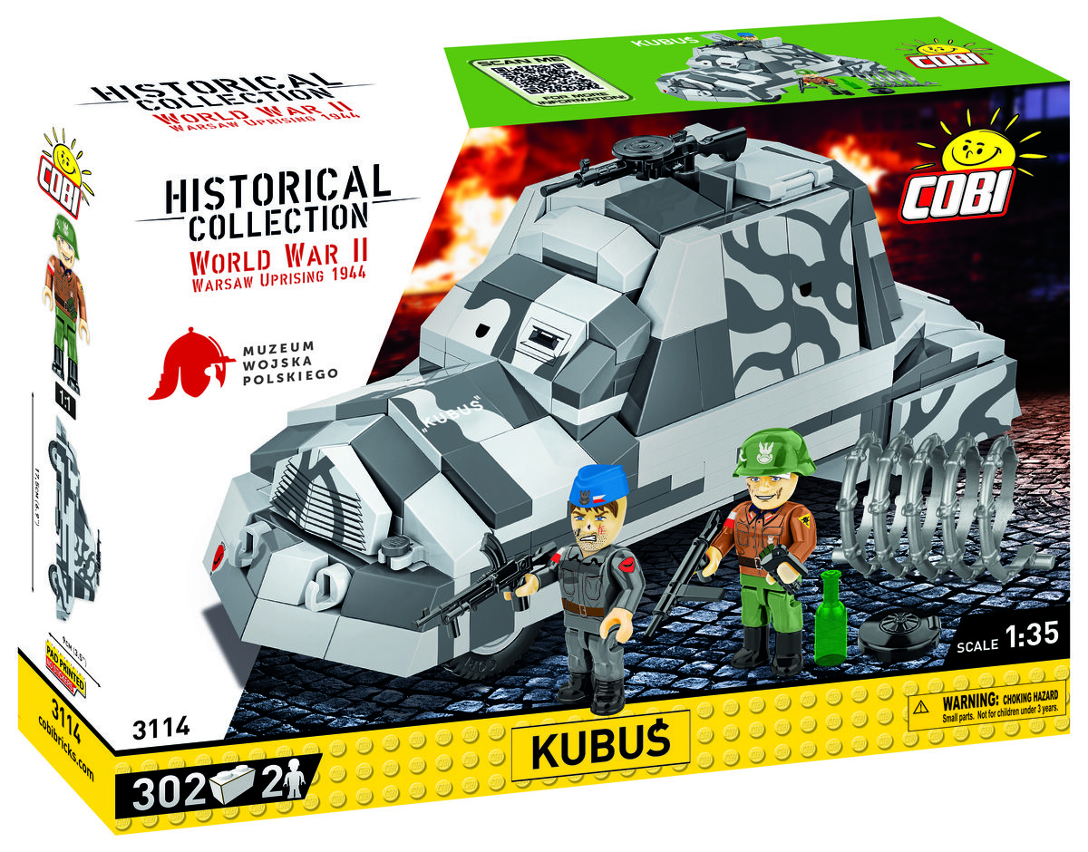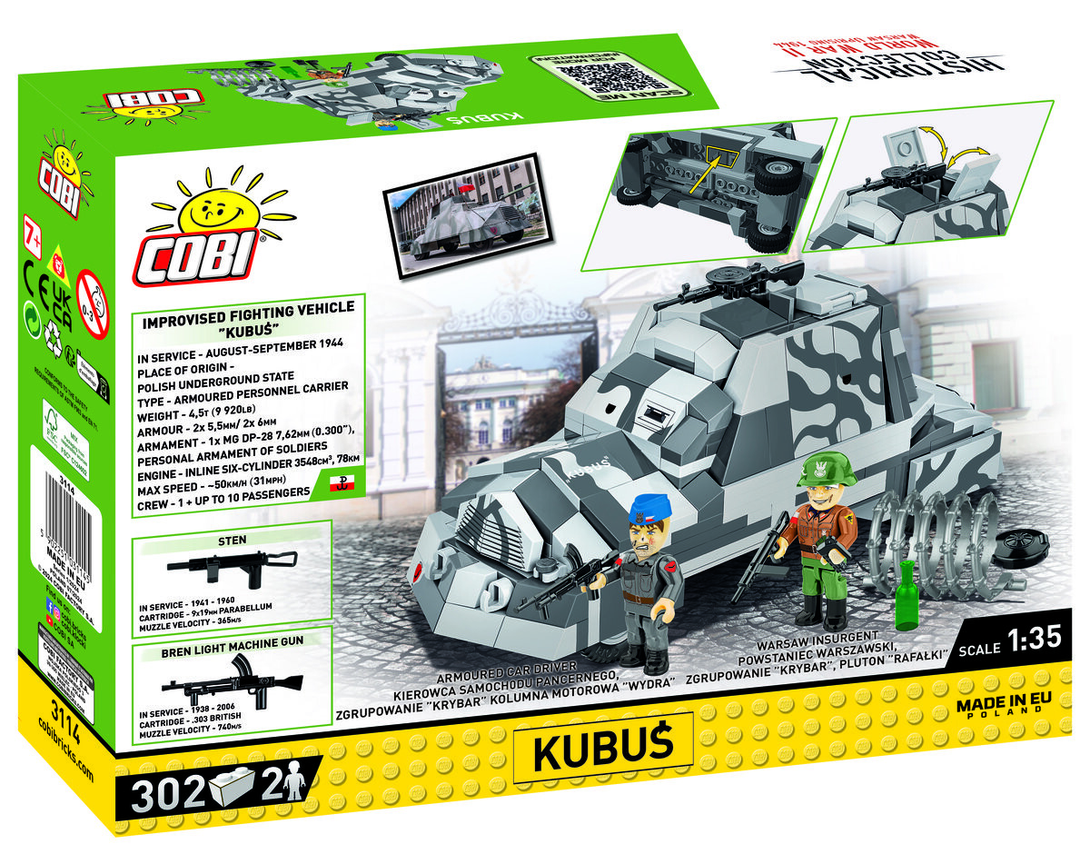 Вместе с Музеем Войска Польского мы решили отметить 80-летие. годовщина начала Варшавского восстания! Мы подготовили уникальный набор кубиков с легендарной повстанческой машиной «Кубусь»! Блочная модель в масштабе 1:35 содержит отпечатки и все наиболее важные особенности оригинала, находящегося в Музее Войска Польского в Варшаве. Мы не забыли даже о такой малоизвестной детали, как эмблема Wydra Motor Column, которая была на бампере! Наша модель была оснащена пулеметом ДП-28. Верхний люк можно открыть, чтобы поместить внутрь фигурку. Не все знают что в Кубусь можно было попасть через дыру в полу! Мы отметили на модели этот необычный вход! В набор входят две фигурки, изображающие варшавских повстанцев. В сером комбинезоне, с бело-красной повязкой на правой руке, с нашивкой «Выдра» на левой руке и синей фуражке мы представили солдата Мотоколонны «Выдра», входившей в состав группы «Крыбар». Второй солдат из взвода «Рафальки». От других формирований их отличало использование в качестве эмблем немецких саперов желтых треугольных вымпелов с черепом, обозначавших заминированную или химически загрязненную территорию. Этот символ расположен на левом плече солдата. Характерная для этого формирования буква «R» нарисована сбоку на шлеме белой краской. Обе фигурки были оснащены аксессуарами, такими как пистолет-пулемет STEN. ручной пулемет «Брен», ручная граната и мина. В комплект также входит бутылка и фрагмент колючей проволоки.