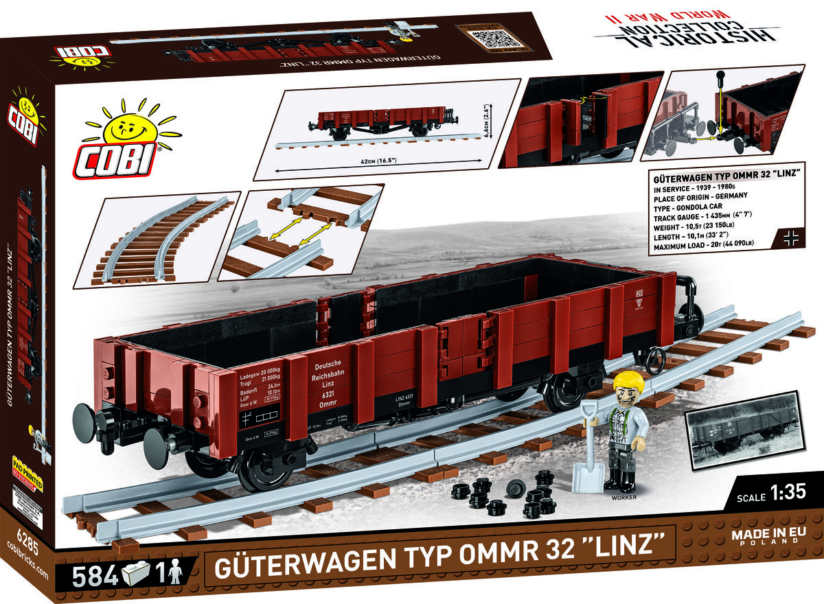 Вагон Güterwagen Type Ommr 32 «LINZ» был спроектирован в конце 1930-х годов. 20 век. Это типичная структура, построенная с учетом предстоящего вооруженного конфликта в Европе. Этот вагон предназначался для перевозки транспортных средств и различных грузов, в том числе: грузовиков, легковых автомобилей, орудий и, прежде всего, бочек и ящиков, а также сыпучих материалов, таких как: уголь . Его грузоподъемность составляла ок. 25 тонн.