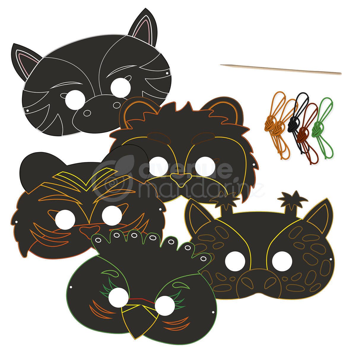 5 масок животных, которые можно соскоблить, чтобы постепенно раскрыть яркие цвета, скрытые под черным слоем. Прикрепите резинку и костюм готов!